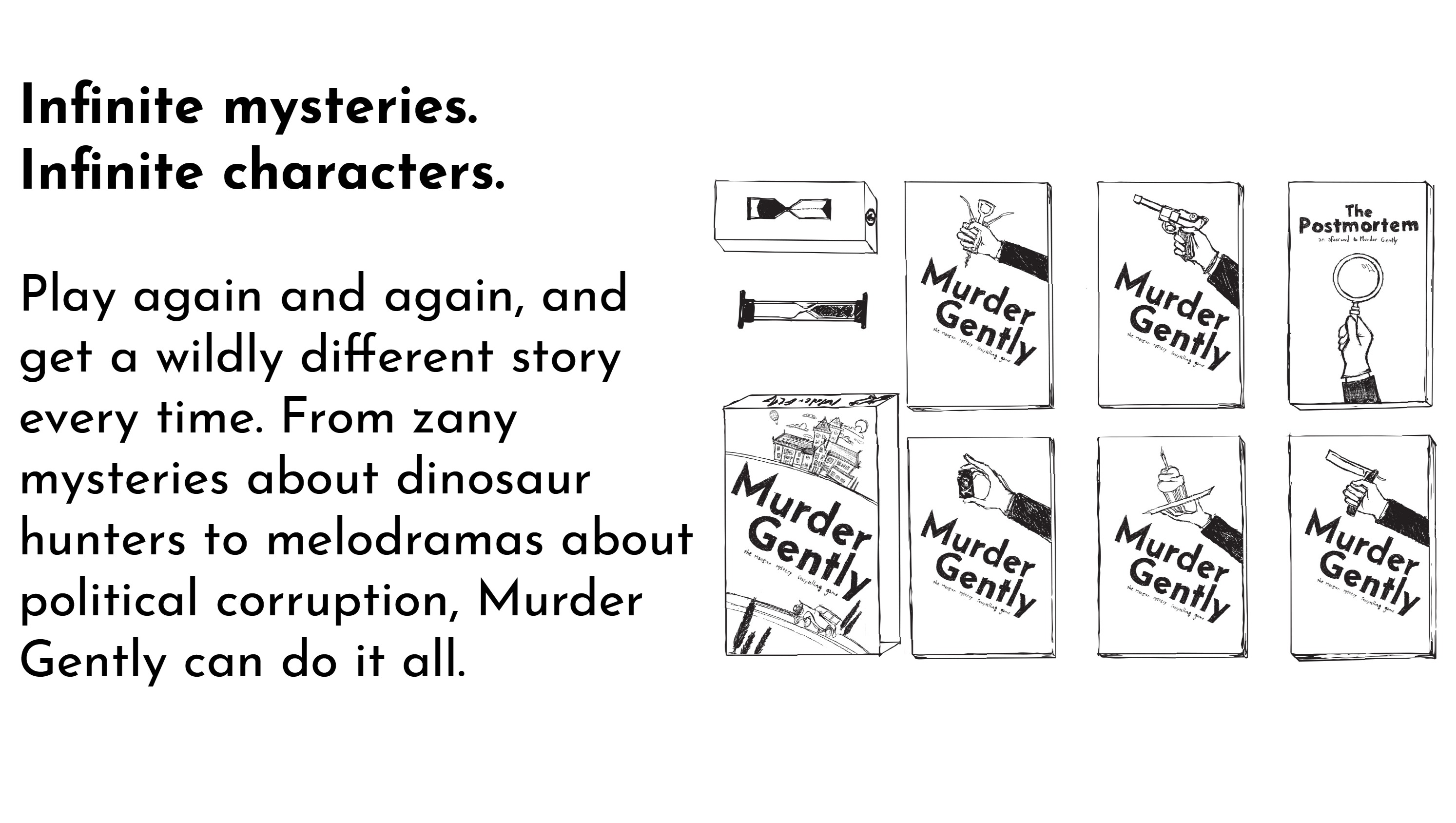 As a storytelling game, Murder Gently works the same way. The play is in the stories that you tell each other. Across four years of testing and iteration, we've found that books help us tell those stories best.