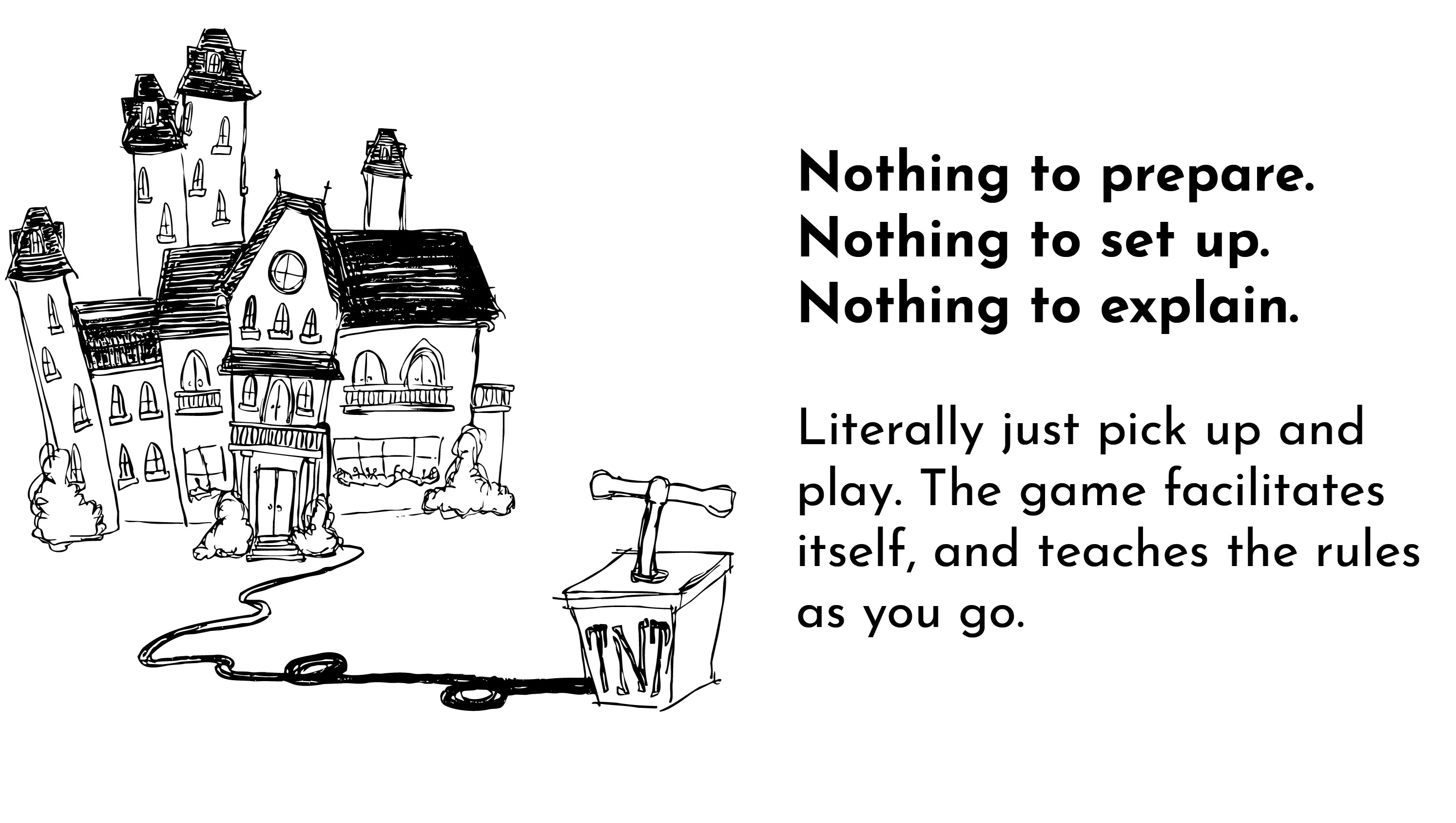Tabletop games usually require someone to read a complicated set of rules, and then explain those rules to the group. Simple games can take ten or fifteen minutes to set up and explain. Complex roleplaying games (RPGs) can take much, much longer. But we're sick of all that.