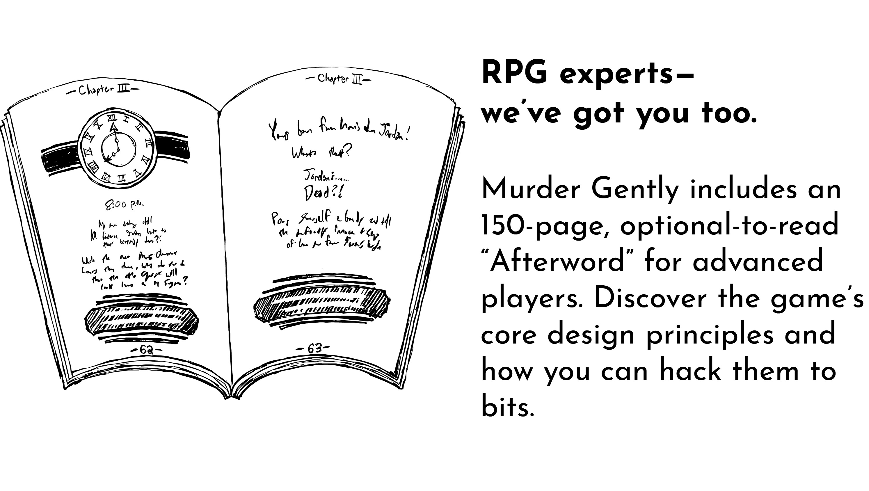 The "Postmortem" is an optional-to-read Afterword for those who've already played Murder Gently and want to dive deeper. It offers an 150-page look under the hood, exploring the game's design philosophy, tips for play, and tactics for making the game your own.