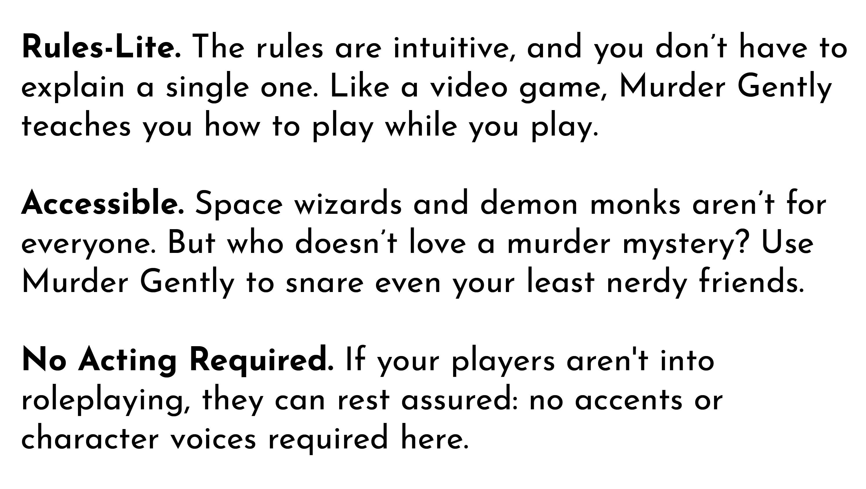 Our takeaway: everyone has the capacity to Murder Gently. In fact, we specifically designed this game to welcome more people into the world of storytelling games.