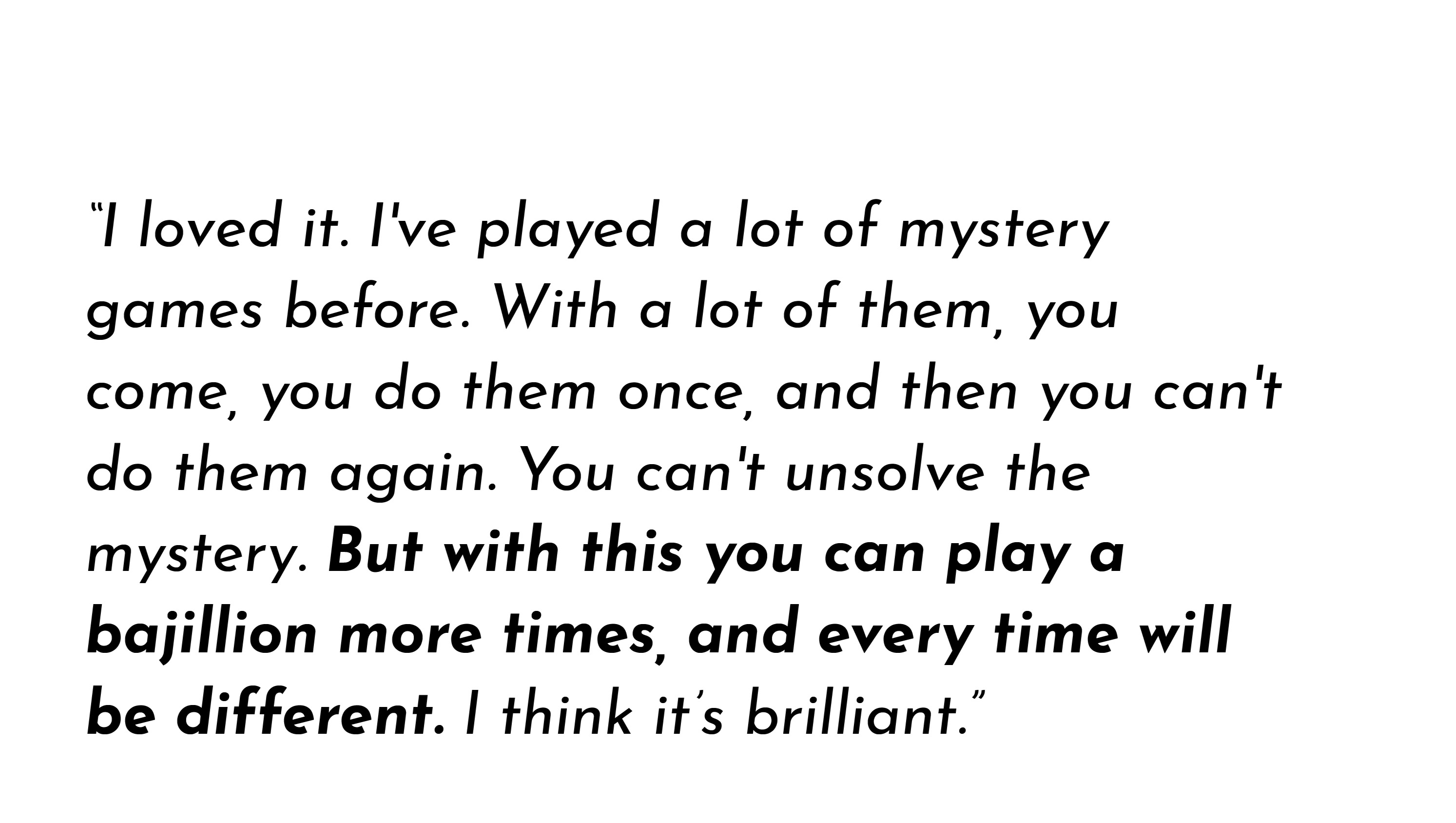 All of this is possible because of Murder Gently's question-and-answer system. Questions are constructed to ensure that every suspect has a motive and every mystery has a solution. They give you lots of inspiration to get you going, while offering you infinite freedom to invent.