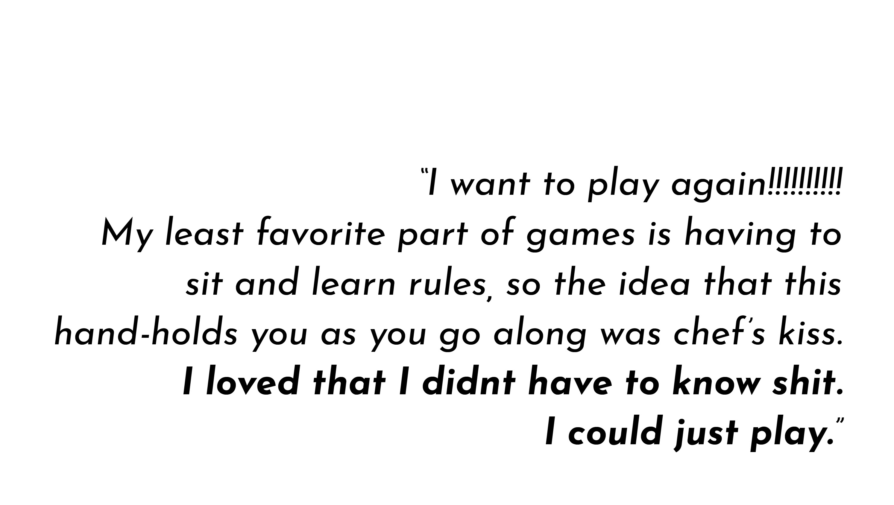 To make sure the design worked, we tested it on programmers, educators, actors, nurses, writers, hospital administrators, students, artists, assistants, naturalists, activists. Someone who mopped up blood and discarded organs for a living. Gamers, non-gamers. Players young and old, new and returning.