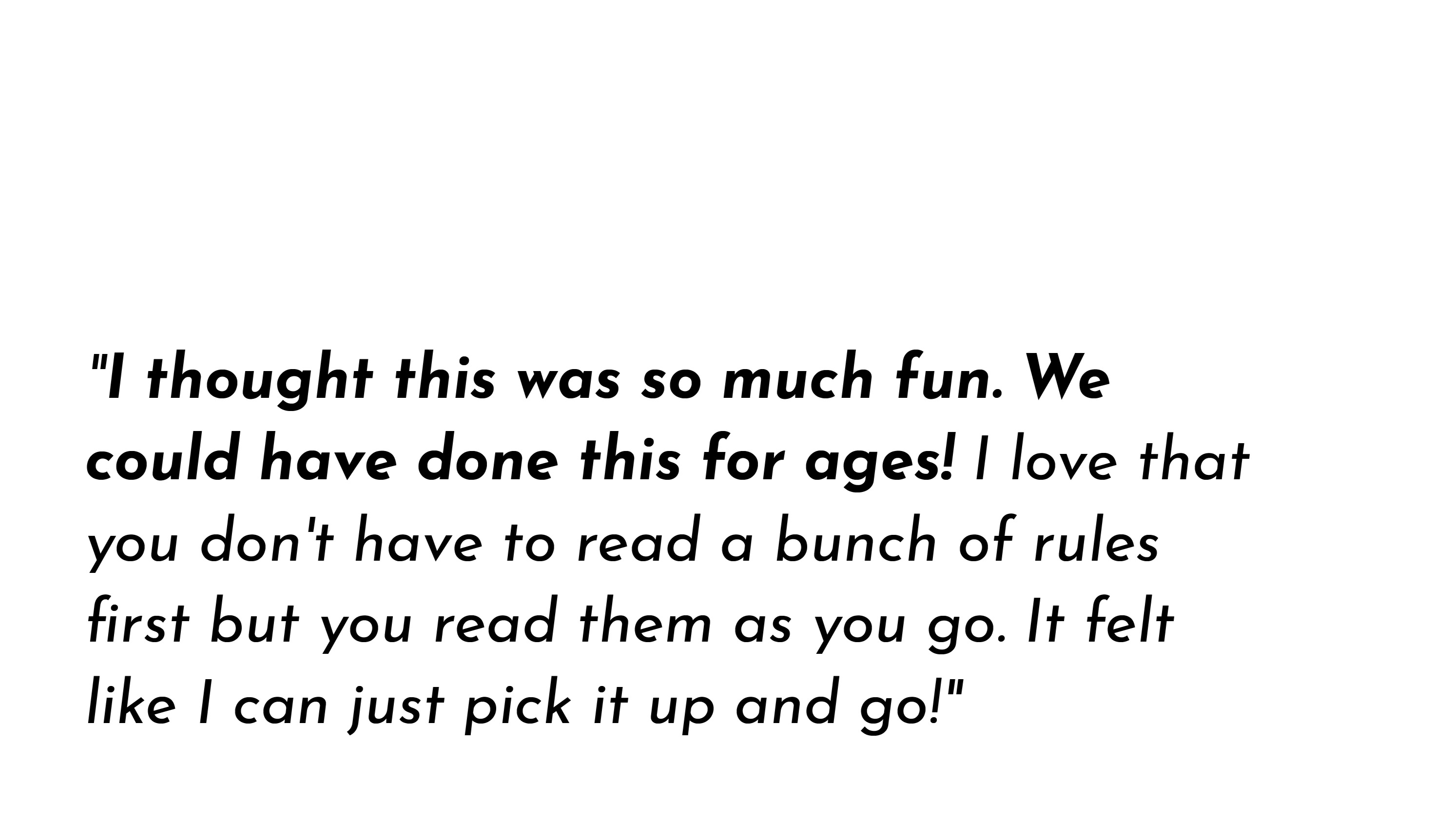 Having said that, if making stuff up on the fly sounds scary to you, be aware that the game will require you to take a leap of faith. You'll have to trust us when we tell you that other non-gamers have done this, and you can too.