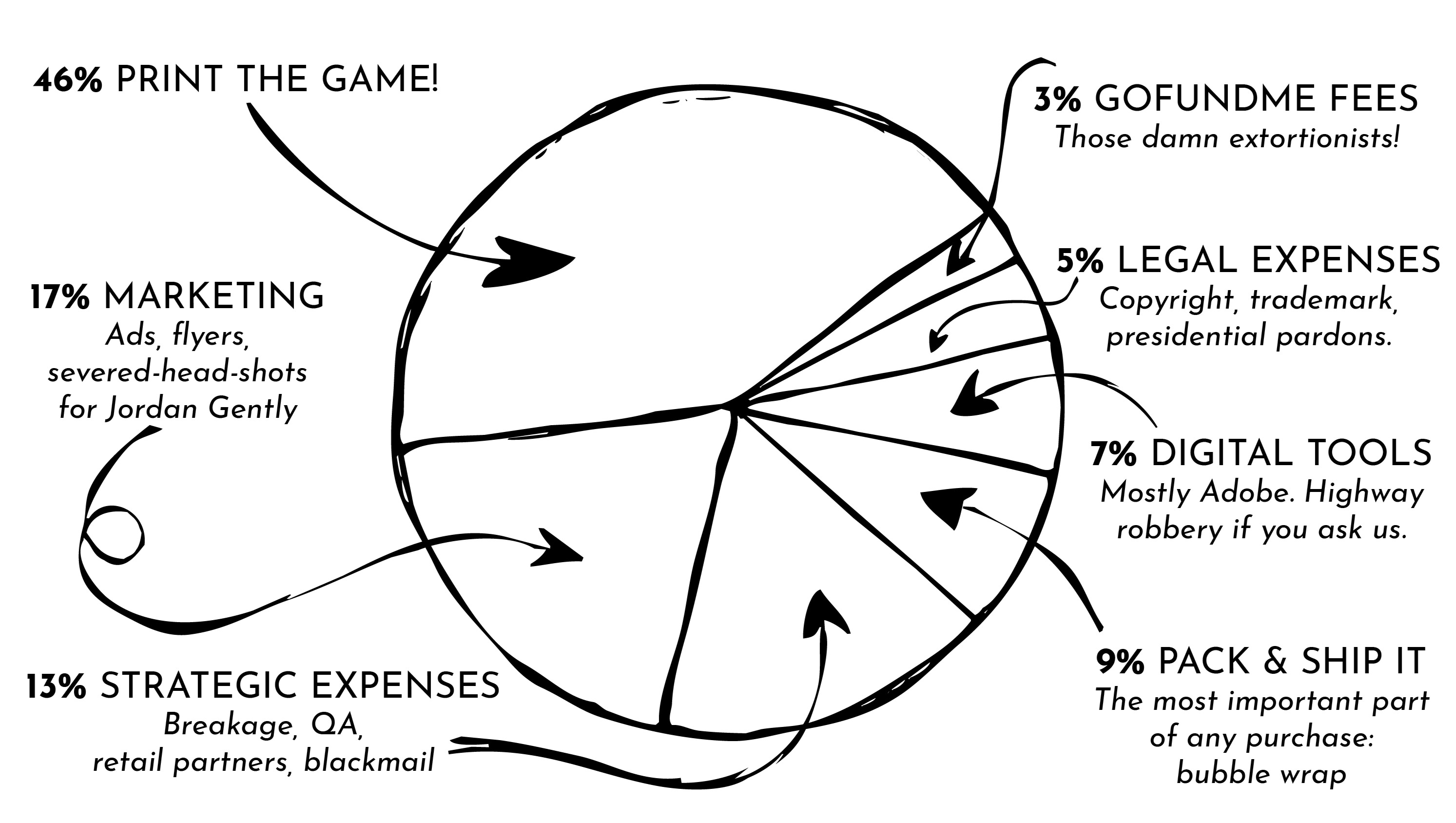The vast majority of capital raised here will finance the first edition of Murder Gently, which is ready to print the minute we’re funded. But there’s more to launching a game than going to press. We’ll need funds to promote, package, and ship it as well. Dollars will go toward continuing to design marketing materials on industry-standard software (which ain't cheap!), printing collateral for game conventions, and paying down the mortgage on our little corner of the internet, MurderGently.com.