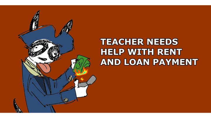 I'm Lugh/fairy. I'm a teacher and a college student. Due to a number of factors, namely all the blizzards we had last month causing my paychecks to be much lower than I anticipated, and my financial aid reimbursement being denied for unclear reasons, I am currently unable to pay off a loan I took out last month to pay out March's rent. I currently need help paying off that loan, both so I can take it out again to assist with April's rent, and to avoid late fees. In order to do this, I need to come up with $800 by the 27th of this month.