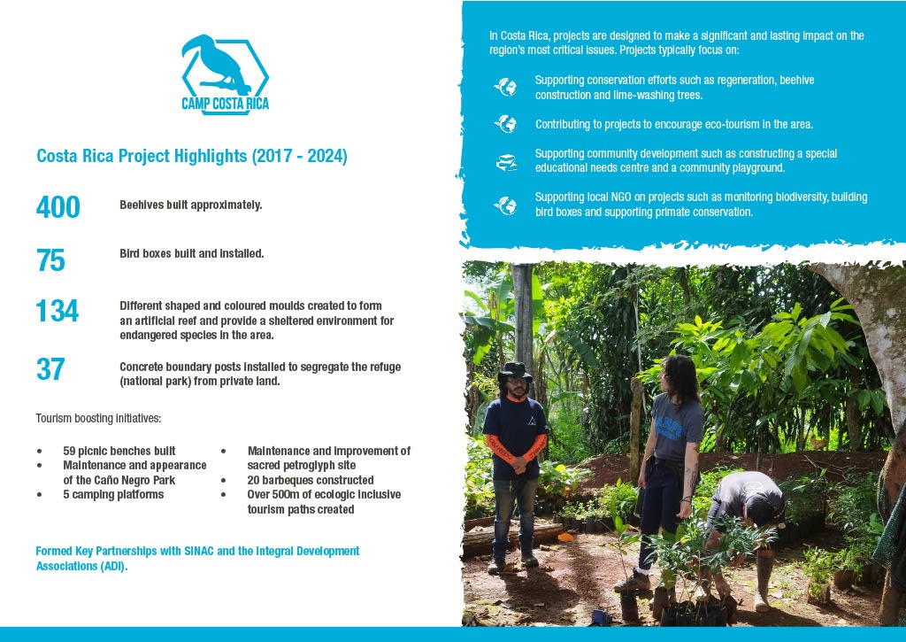 Hi, my name is Tess and I’m fundraising for a once in a lifetime expedition to Costa Rica in 2027. This Camps International trip will last for 4 weeks and during that time I will be helping out on multiple conservation and community projects. Costa Rica is one of the most bio-diverse ecosystems in the world but faces challenges such as habitat destruction and pollution. So, I am excited to go on this trip and work on projects that include: