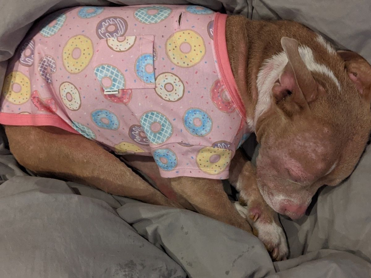 Hi! I have pictures of my baby Lexi here. My family and I adopted Lexi from a rescue shelter after she was found stray as a puppy. She was at the adoption center for about 7 months. When we adopted her, she was almost 2 years old. She is a very sweet and energetic friend with lots of love to give. She is now 6, almost 7. For almost 18 months now, she has been suffering from head-to-toe yeast infections. This causes her to be very itchy, twitchy, and severely uncomfortable, and we have to keep the inflatable cone, along with some very fashionable shirts, on her or she will scratch until she bleeds.