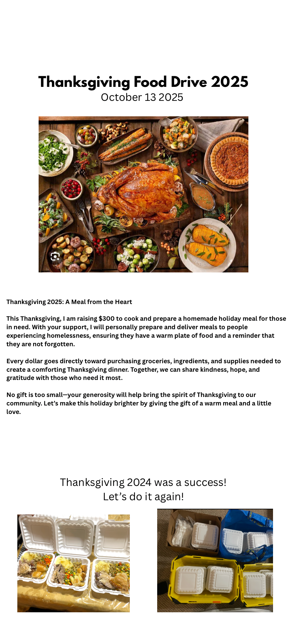 This Thanksgiving, I am raising $300 to cook and prepare a homemade holiday meal for those in need. With your support, I will personally prepare and deliver meals to people experiencing homelessness, ensuring they have a warm plate of food and a reminder that they are not forgotten.