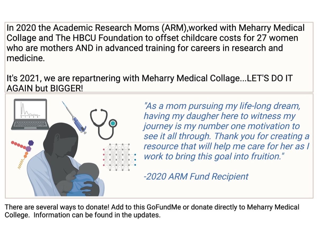 HERE WE GO - YEAR TWO! WE DID IT RIGHT IN 2020 SO LET'S KEEP IT GOING!! Last year we raised over 65K, let's add to that total through the GoFundMe and direct donations to reach a total 2021 goal of $75,000 in new donations. That's enough to give an average of $2,500 towards childcare costs to 30 women who are pursuing their careers in academic STEM/Med fields while also parenting!