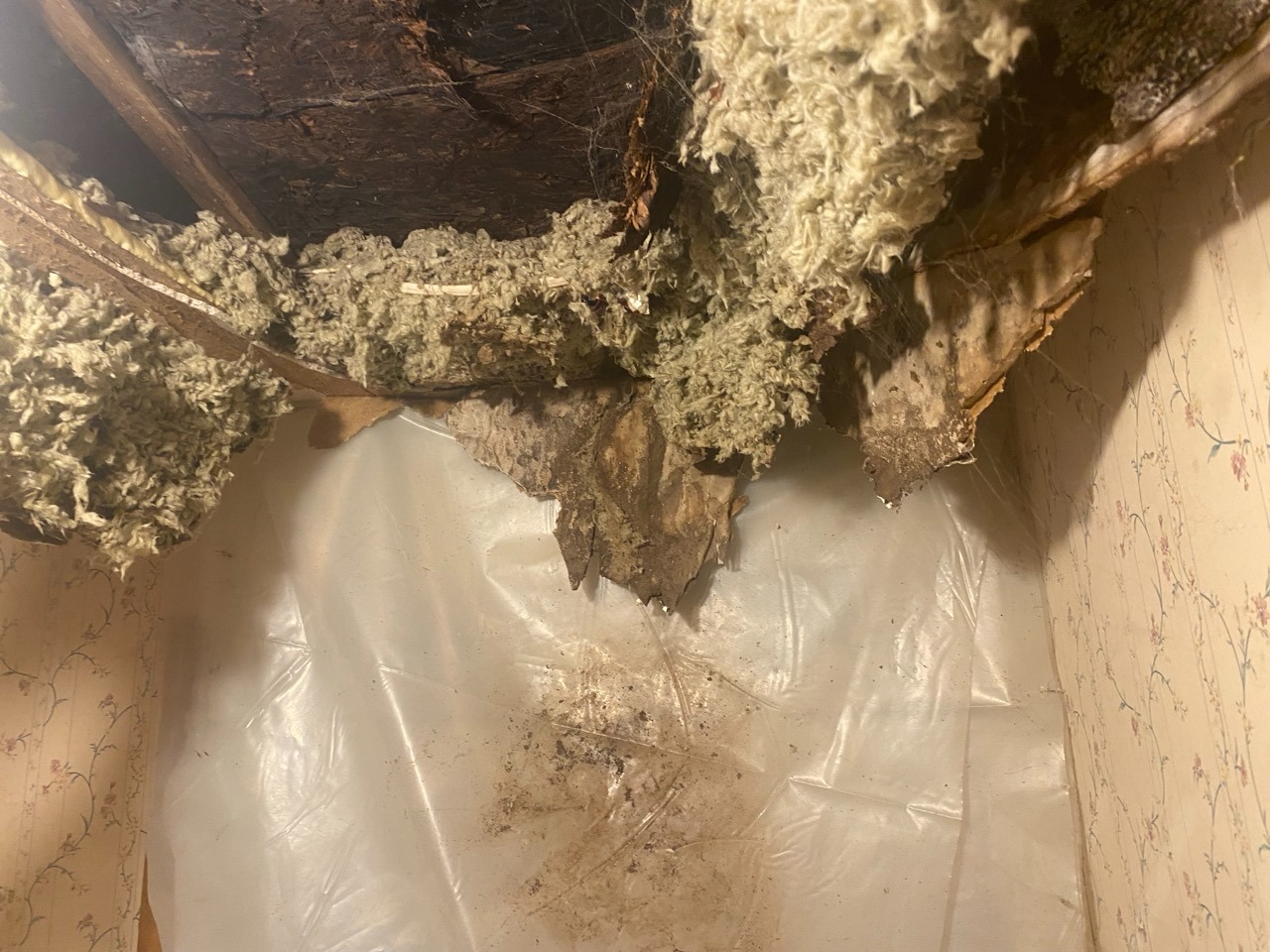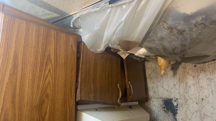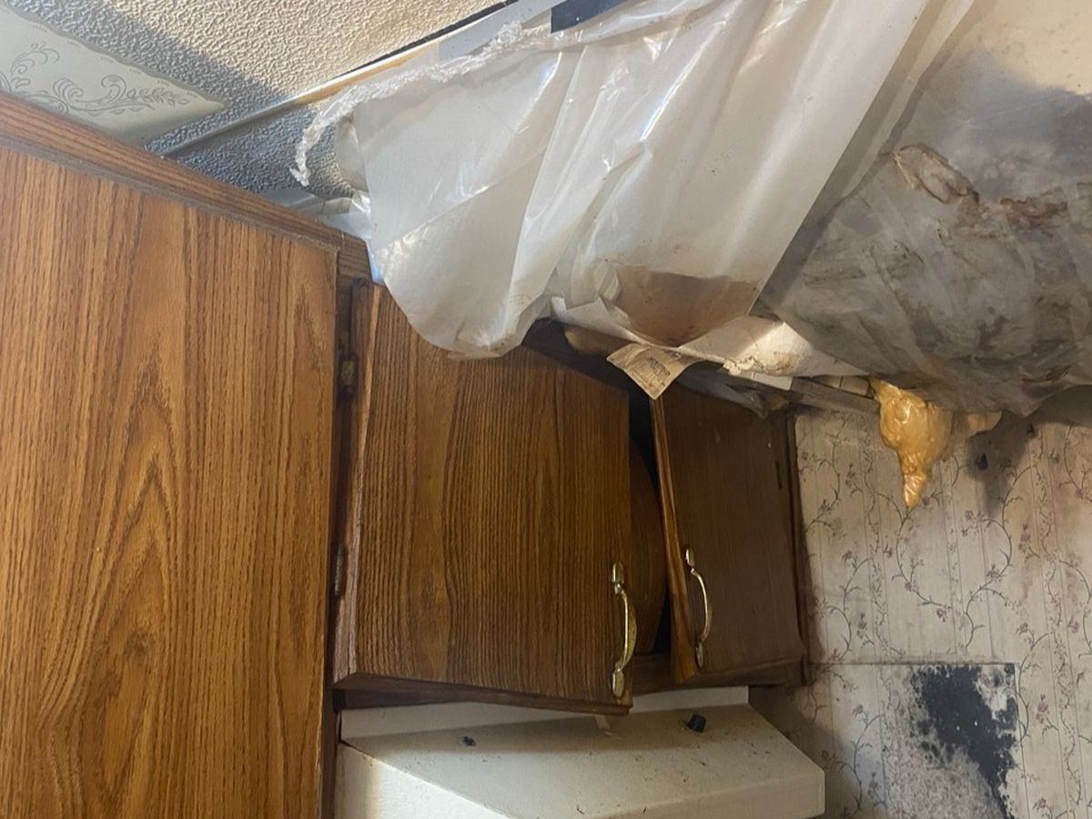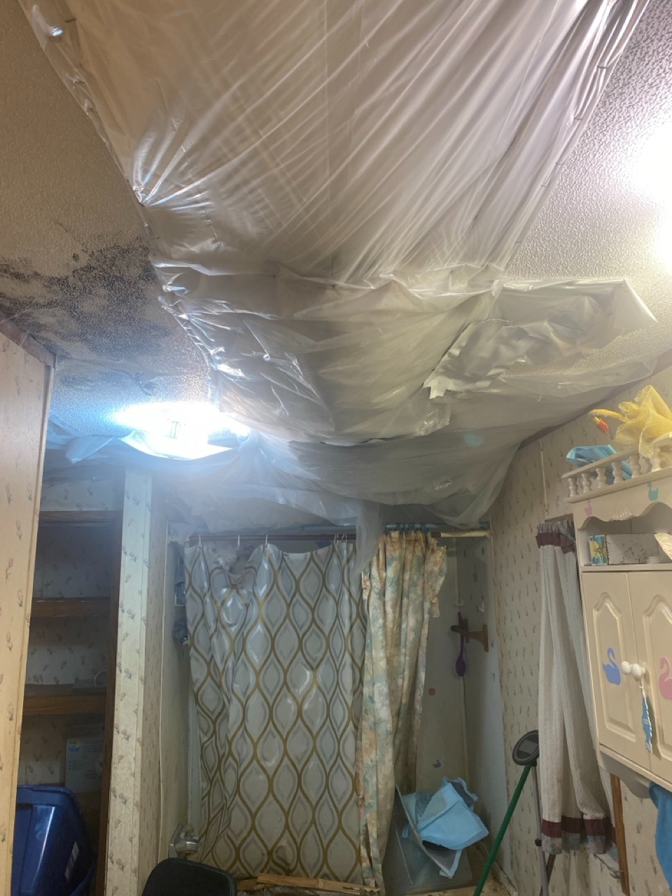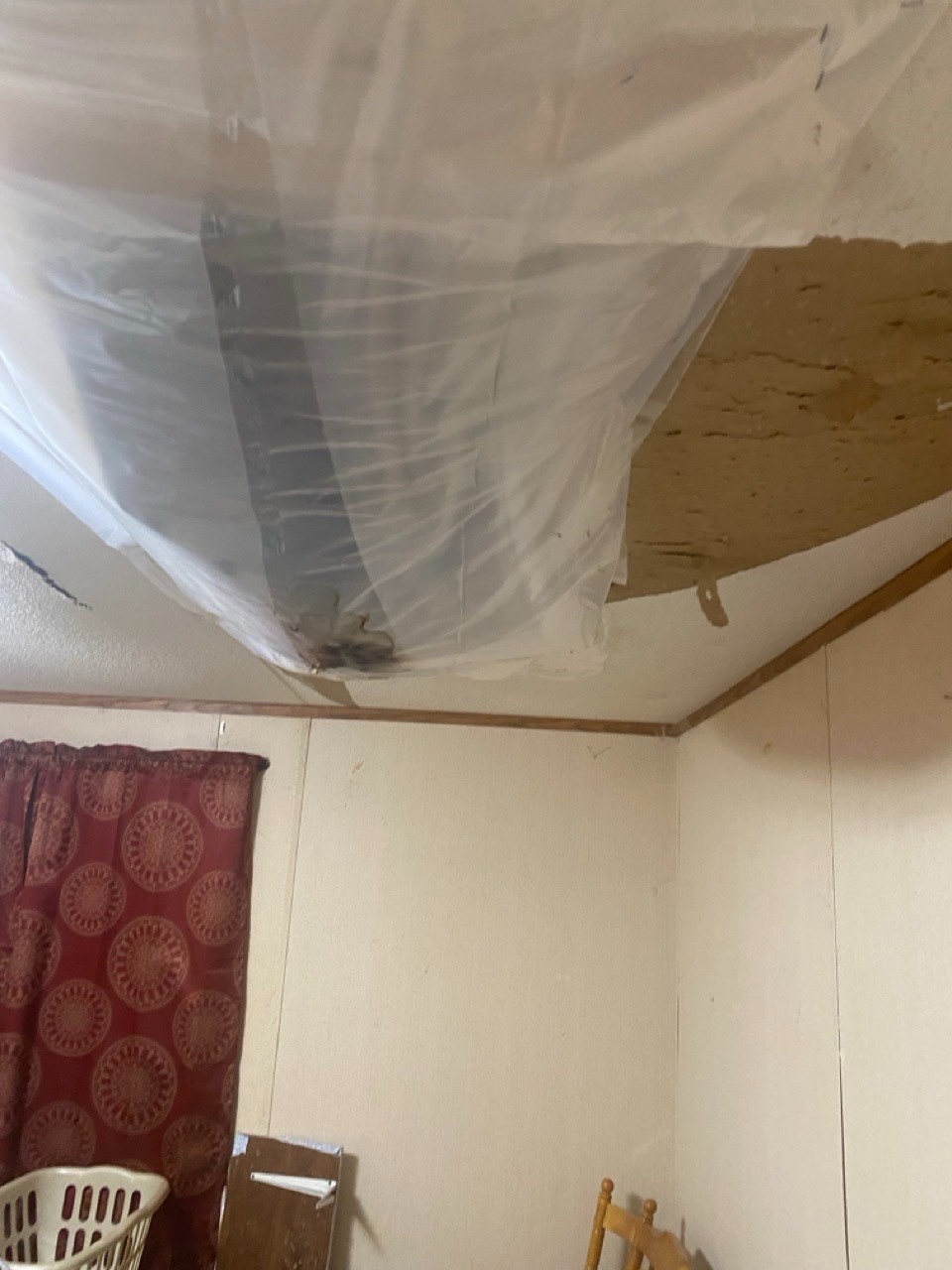 Every time it rains, we live in fear of a collapse. Twice now, Mom herself has very nearly been injured by partial celing collapses in her bedroom over top her bed. Last summer during a heavy downpour, I was in the kitchen and got knocked down by some of the ceiling caving in with a ton of rain water right in front of the refrigerator. It was devasting, to say the least.