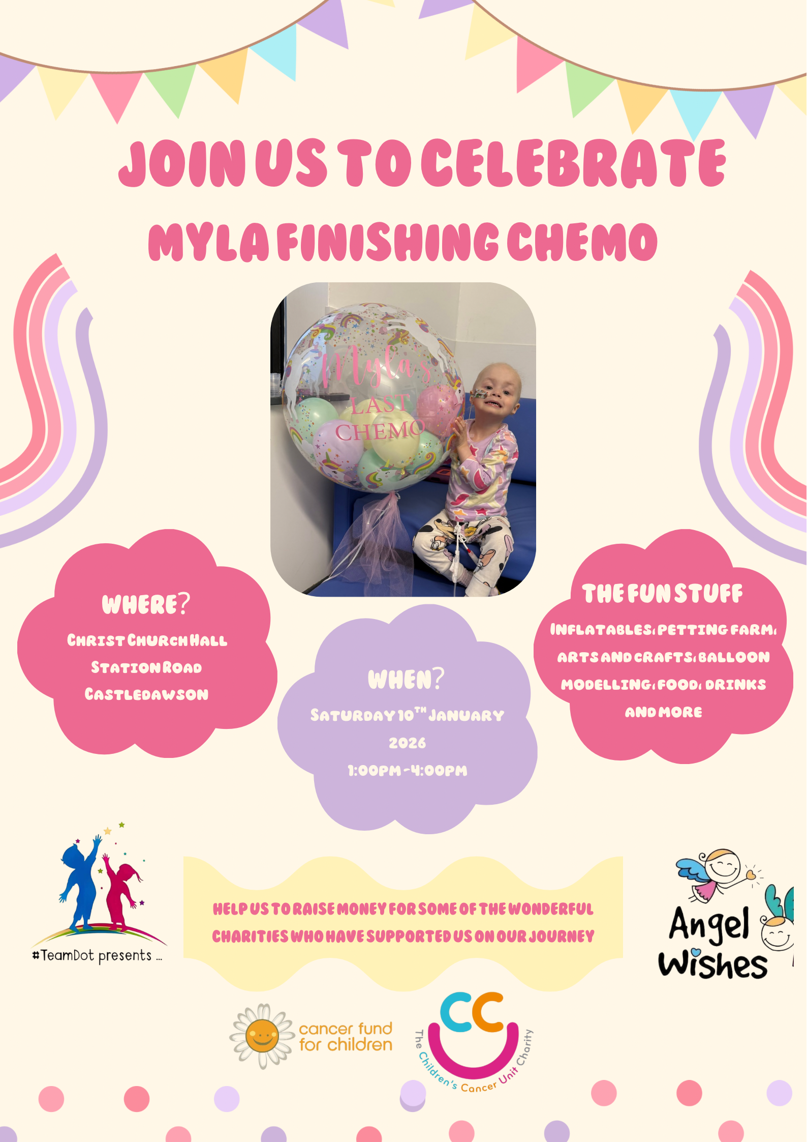 The four charities we are supporting are Angel Wishes, The Children’s Cancer Unit Charity, Cancer Fund for Children and Team Dot Presents.
