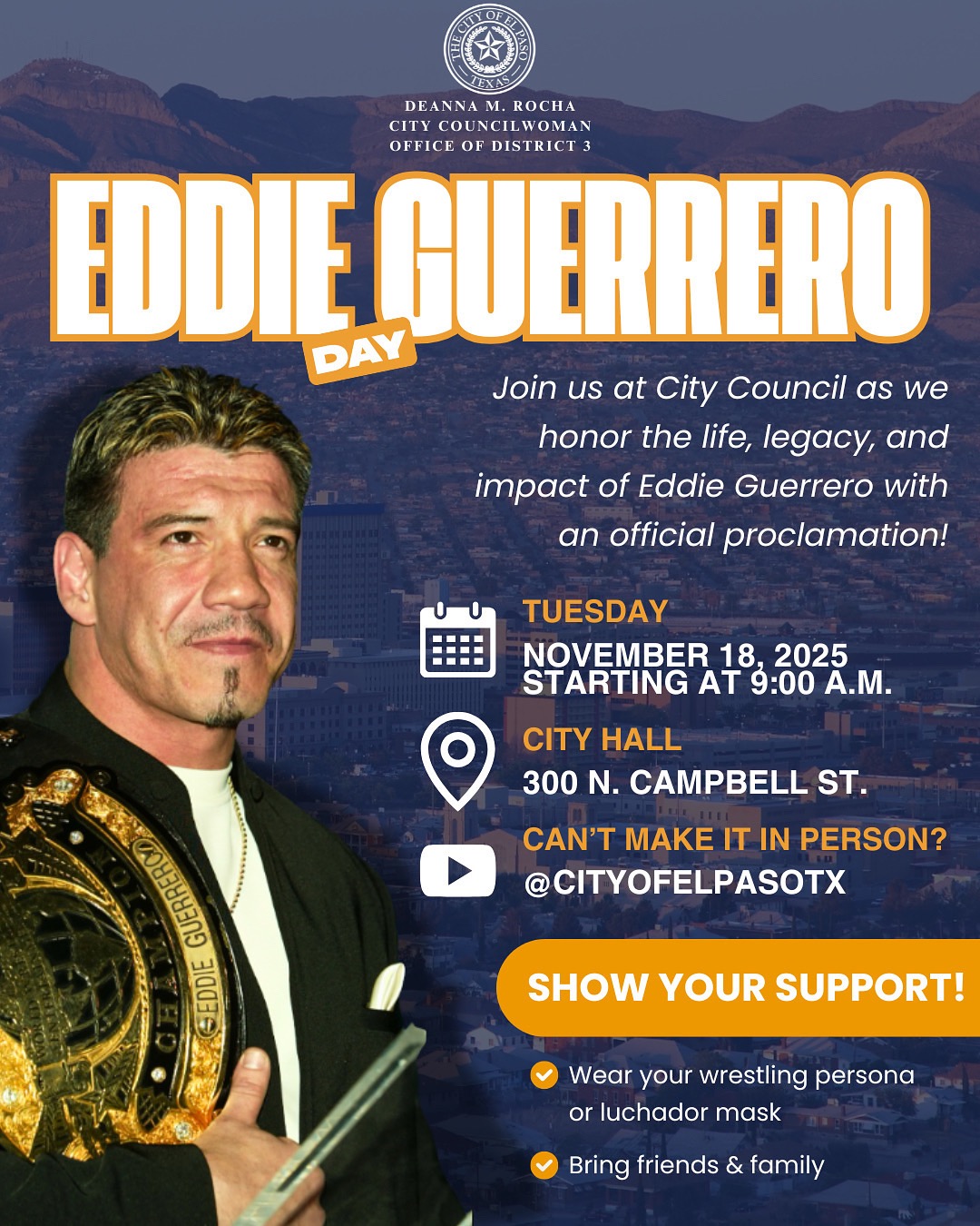 We’re launching the Eddie Guerrero Legacy Project, a community effort to permanently honor Eddie’s memory in El Paso through art, recognition, and celebration.