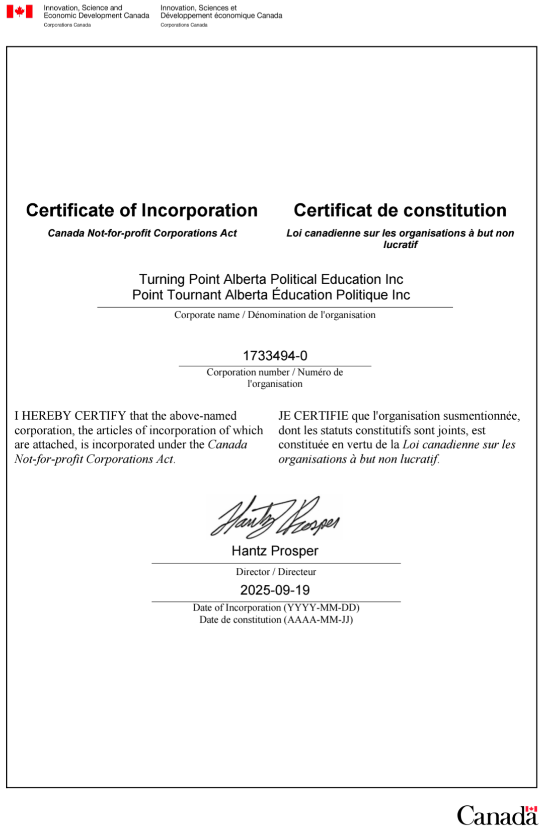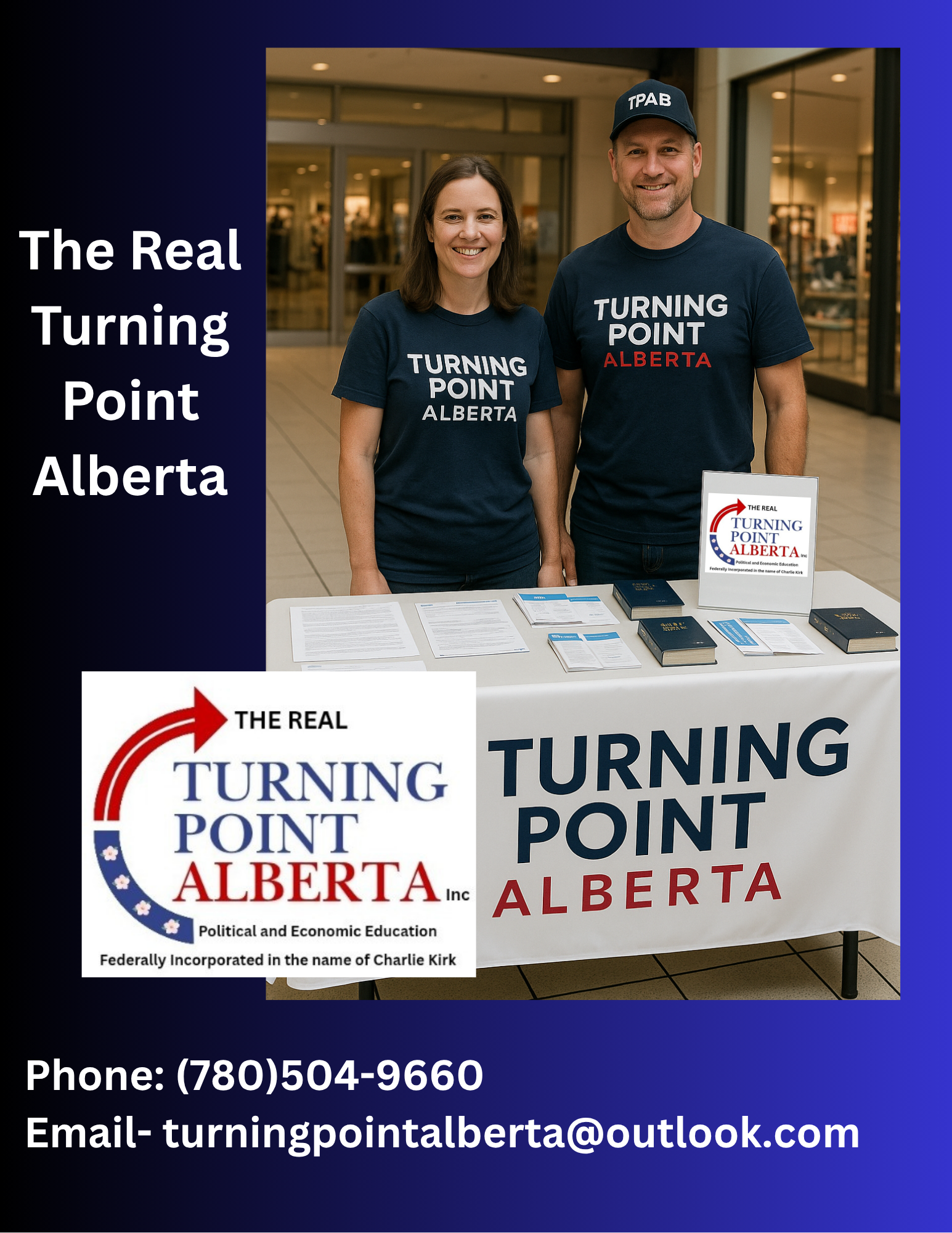 Turning Point Alberta was recently legally incorporated/registered as a non profit organization and is legally recognized by the Canadain government. We are seperate and distinct from the national effort and will remain uniquely provincial while Alberta navigates it's political future. We are launching in the name of Charlie Kirk to continue his works and legacy beyond the borders. We strive to give Albertans- especially the youth of Alberta- the education, tools and encouragement they need to thrive and make a positive impact in their communities. We pride ourselves on conservative values and believe critical thinking, limited government and political and economic education is paramount to maintaining a free and democratic society free from corruption. We believe we can achieve this by cultivating Albertans youth, like Charlie was doing across the border.