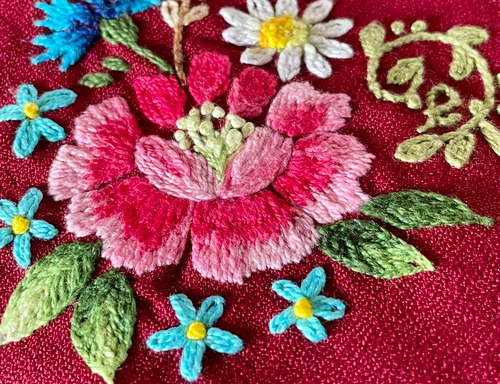 The dress also features pieces of Lambani embroidery gathered by Kirstie during her travels in southern India in 2002, honouring the hours she spent stitching alongside Lambani women. Without a common language these interactions unfolded through a shared love and understanding of stitch and embroidery. They had a profound effect on Kirstie and seven years later provided huge inspiration for creating The Red Dress.