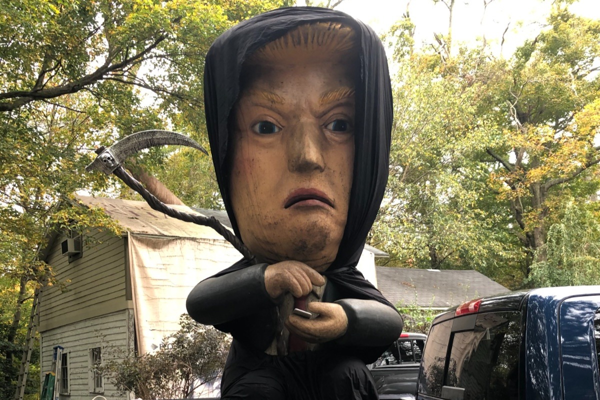 Seated on a gold toilet, Trump will be texting with his tie in the toilet. His shifty eyes move and his mouth opens to say "no collusion" "witch hunt" "stable genius" and "fake news." He wears a red hat emblazoned "Make America Great, Impeach Me" and, of course, farts.