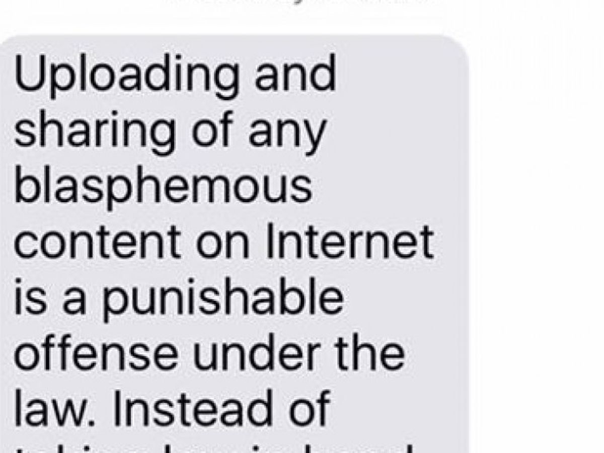The photo at the top of this page is screenshot from a mass text sent out to cell phones in Pakistan, one of several urging people to find and turn in secularists operating on the internet.