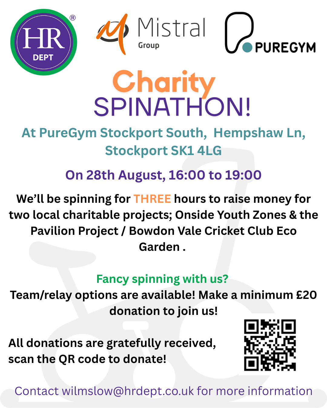 There are 20 places for people who want to take part in the spin session, for which we ask for a minimum £20 donation to be made. Click here to register to spin with us. We plan to have lots of fun to some great tunes amongst the hard work, led by some of the fab PT's at Puregym!