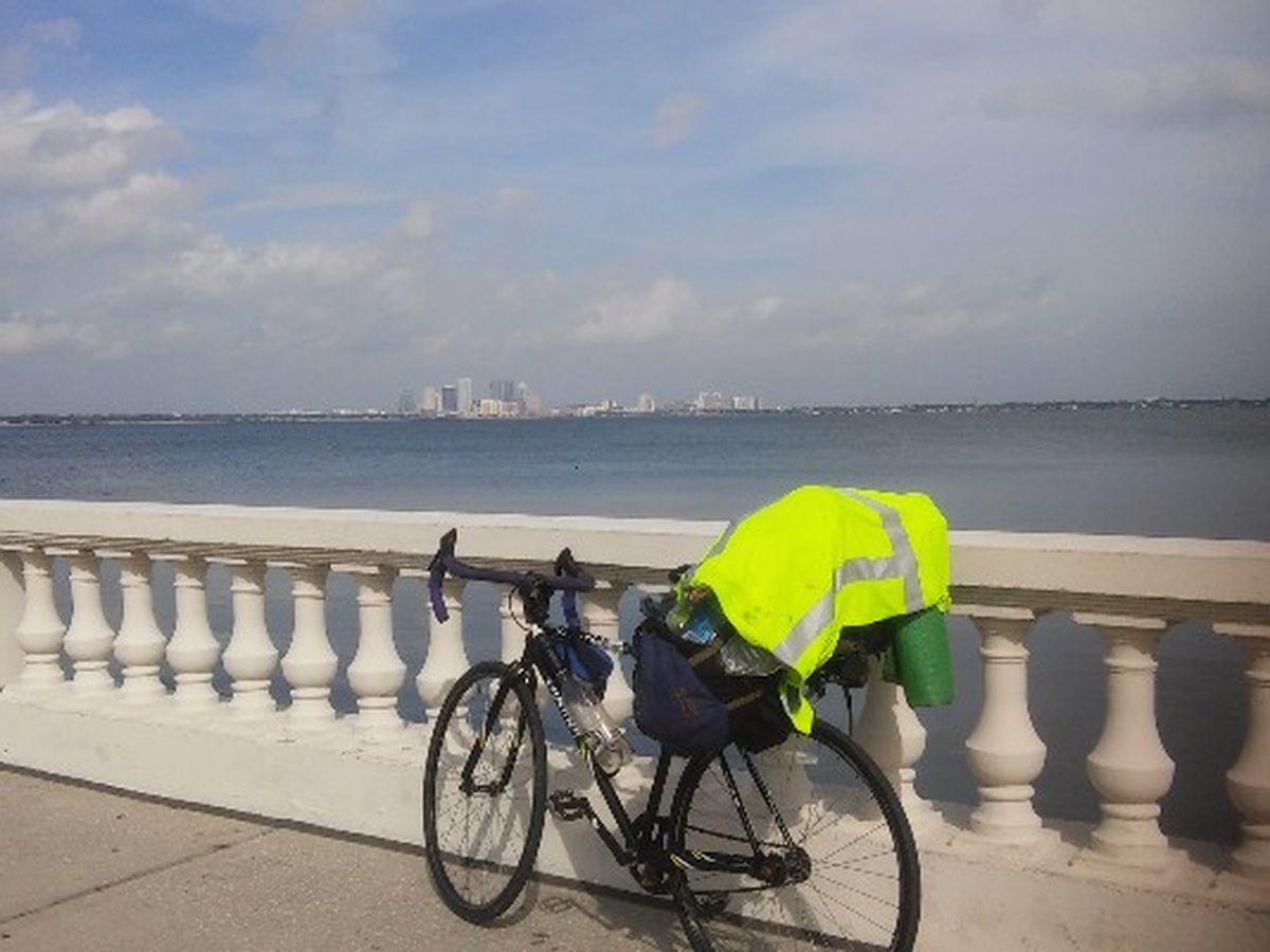 I am writing after a 24 mile ride with a tail wind, a workout of pushups and pull ups, 22 miles back against the wind, a bonk, aka wall, aka, my ass and legs are killing me. I accepted that wall psychologically that day. As I get stronger, my wall becomes closer to a black out, and I believe when I hit my peak I will be unconscious, truly never being aware of hitting it. After this “wall” I did a 2 mile run, got back on the bike, went over a causeway bridge to finish my training for the day. Two of those twenty two miles back against the wind were ridden across grass on the side of highway 41, going against traffic and big truck wind gusts to find my side mirror that flew off my handle bar going 23mph on the way down somewhere between my energy/electrolyte concoction kicking in and getting directly aligned with very strong Southwesterly Florida winter wind gusts. My average-speed hybrid bike began to carry itself. I got down into racing position and flipped to my highest gear. As I am riding on a freshly paved road finished only days ago, I watch the speedometer climb from 17 mph to 18, 19, 20, 21, 22!, 23! I carried a pace at 23 mph for a couple miles until my legs started to burn, then I focused on my posture, tucking my elbows and knees in, straightening my back, going heel to toe as I am pedaling. I look down and see 25mph. “Ok, I can hold this speed. My breathing is normal, controlled, in rhythm with my pedaling and probably my heart beat, my legs feel solid” Then I notice my mirror is gone. “Ah Crap” I hadn’t looked at it for miles. I see across the highway some yellow flags violently waving in my direction of travel. “Ok, well I have a rocking pace going; I will start looking from this point backward on my way back”. It turned out to be over two miles up the highway from there laying on the road with a crack straight down the middle. I soon realized my dependency on having a mirror. It’s like not having your watch or cell phone. You feel naked without it. A simple thing like a mirror can buy you a few precious seconds to get out of a vehicle’s way. It also saves neck strain and is a great thing to have. Luckily, I have a spare in new condition. (I ended up breaking that mirror later as well and have resorted to a helmet mirror.) Ear plugs are another great discovery. They lower the noise of passing vehicles which can be distracting and make a fun ride unpleasant. They also prevent wind from rushing passed and into the ear as well as allow you to hear yourself breathe and be at peace while riding. All of this to ride a bike across the continent. I will go on a bike tour, finally.