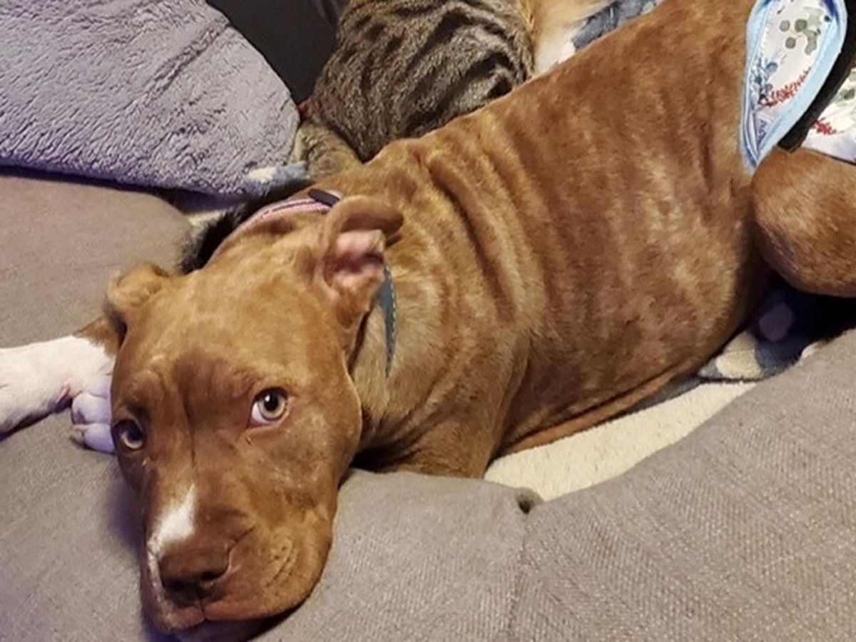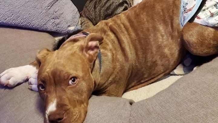 This is Finn. She is a 22 week old American Pit Bull. My sister and her husband adopted Finn from the local Humane Society. When they brought her home they noticed that she was leaking urine. They found this odd and immediately took her to be seen by their vet. They were not told about her incontinence at the shelter. They were told she had some scar tissue in her abdomen due to a possible infection as a puppy, but that was all.