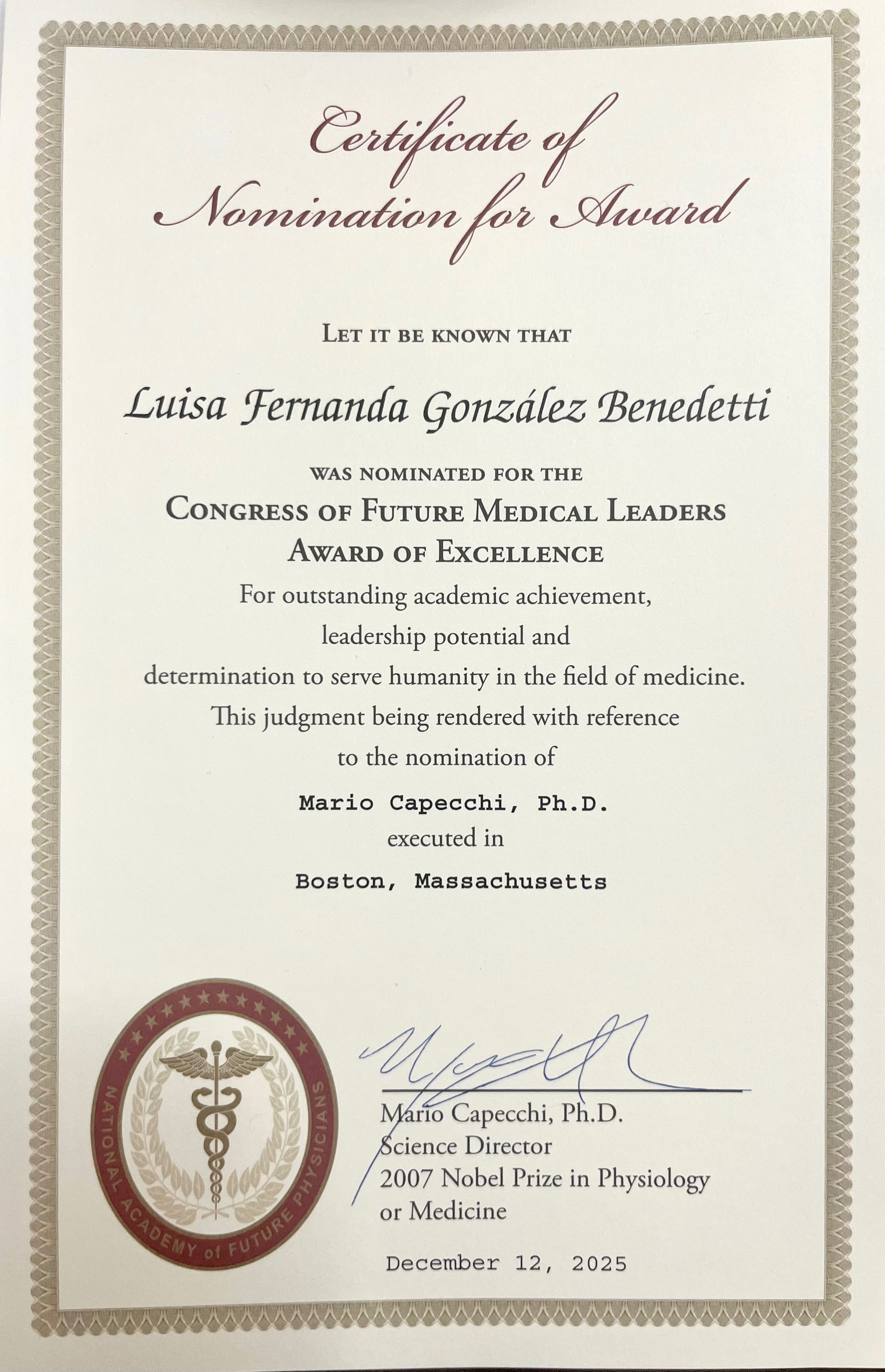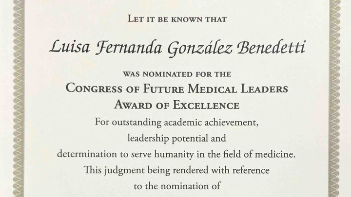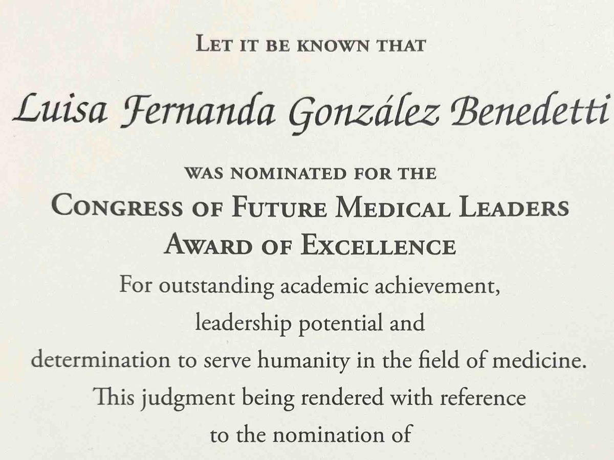 Dear Sirs/Madams, greetings. My name is María Teresa, mother of Luisa Fernanda González. I am writing to request your valuable financial support to help cover travel and accommodation expenses for my daughter's recognition ceremony in Boston. Luisa has been selected as one of the future medical leaders of the state of Indiana. Your contribution will enable my daughter to attend this very important event and proudly represent our community. We thank you in advance for your generosity.