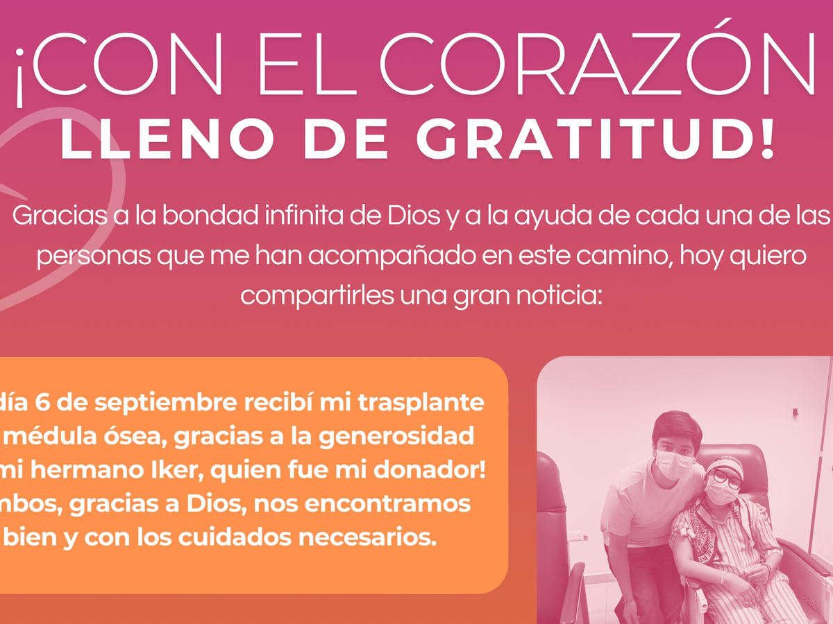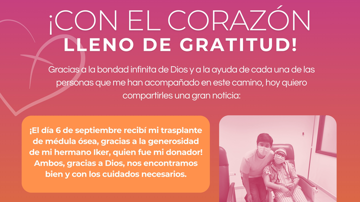 El pasado 6 de septiembre 2025 recibí mi trasplante de médula ósea, gracias a Dios, a ustedes y a la generosidad de mi hermano, quien fue mi donador
