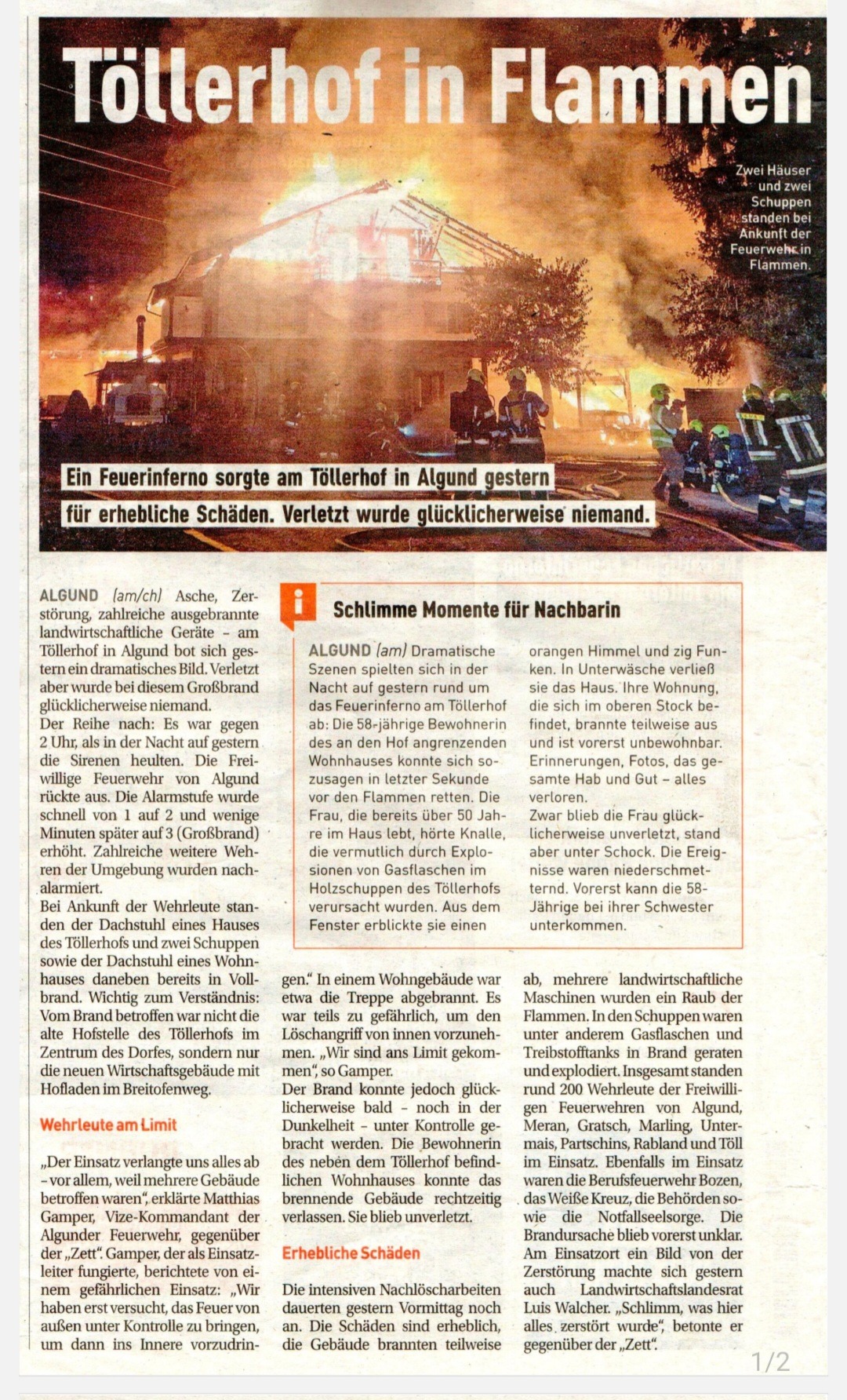 Nella notte del 5 luglio, il Töllerhof di Lagundo – una storica azienda agricola biologica nel cuore dell’Alto Adige – è stato gravemente danneggiato da un devastante incendio. Due abitazioni e gli edifici agricoli principali sono andati distrutti. Fortunatamente la famiglia è rimasta illesa – ma i danni materiali ed emotivi sono profondi.