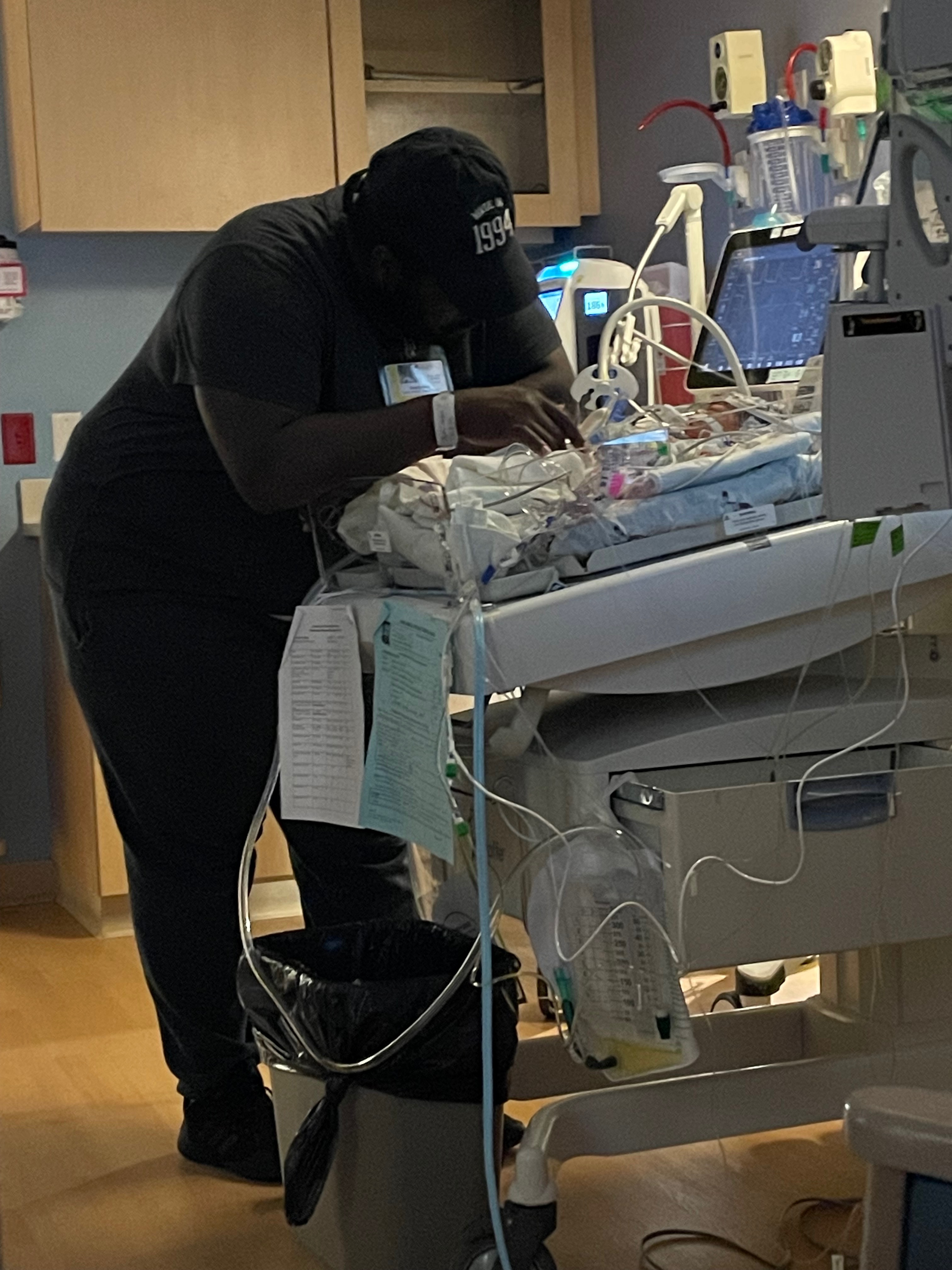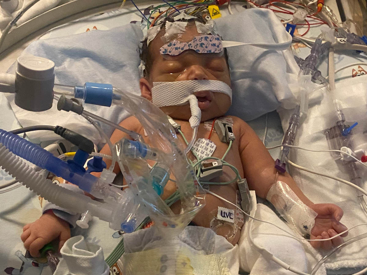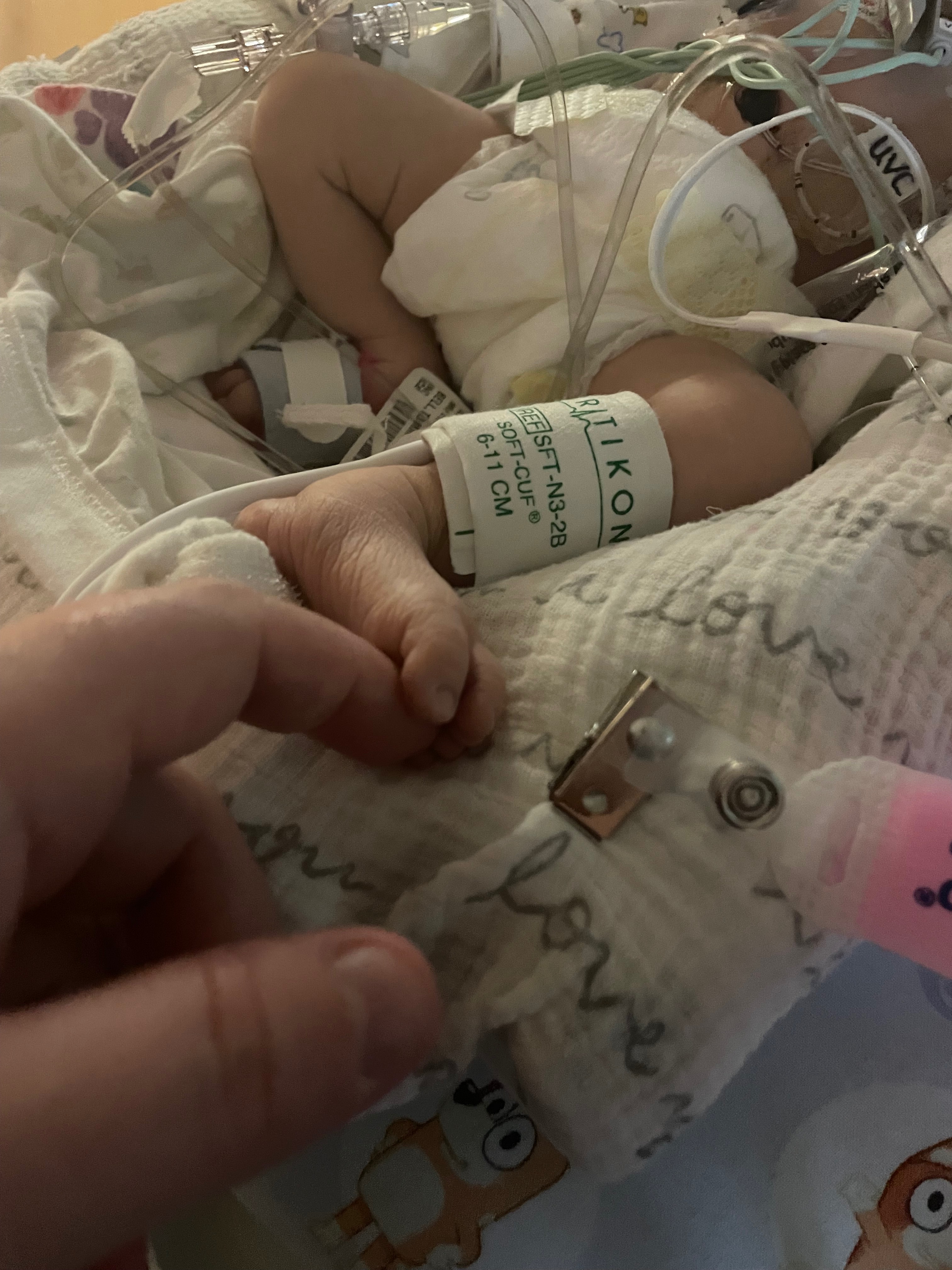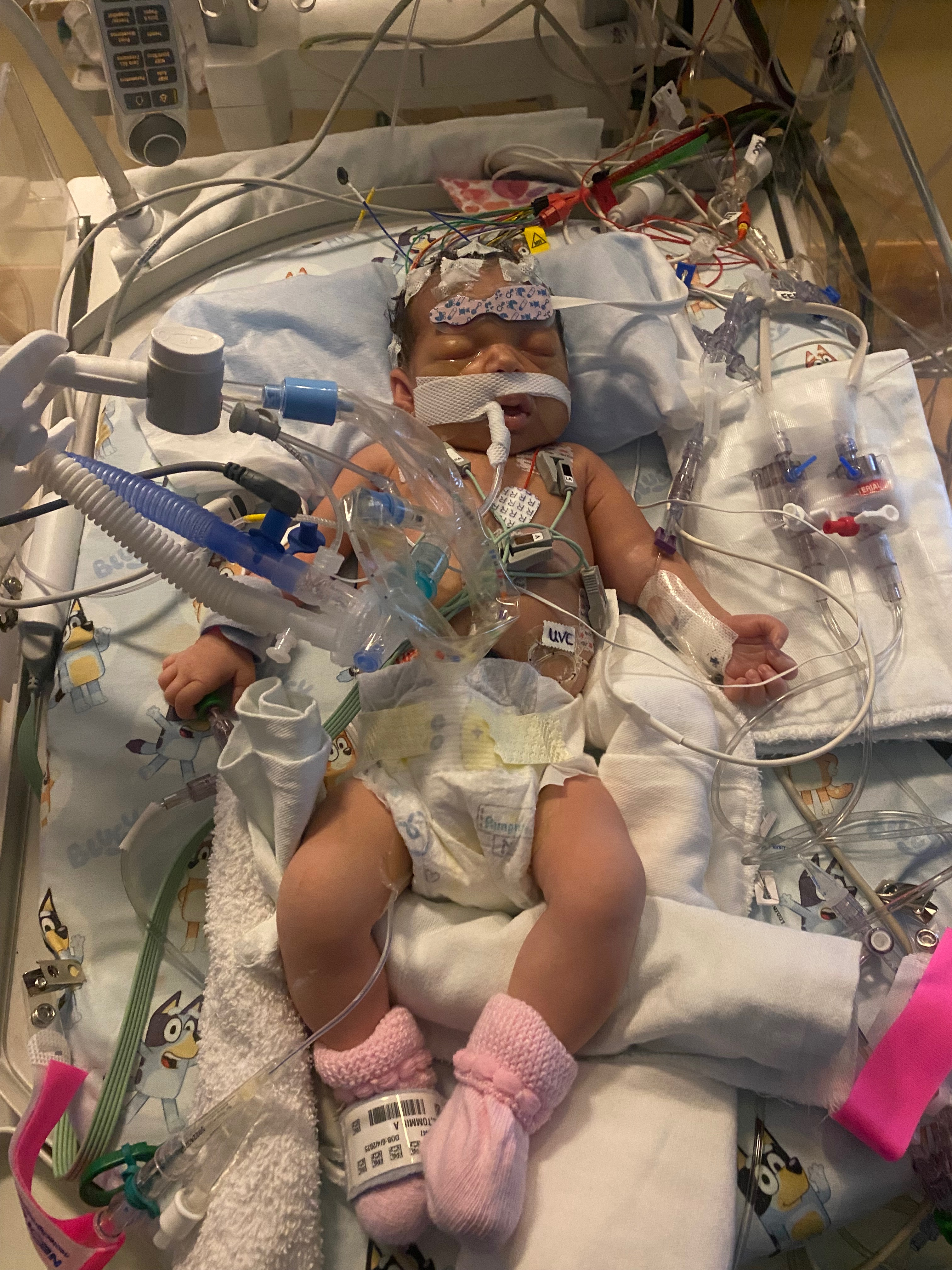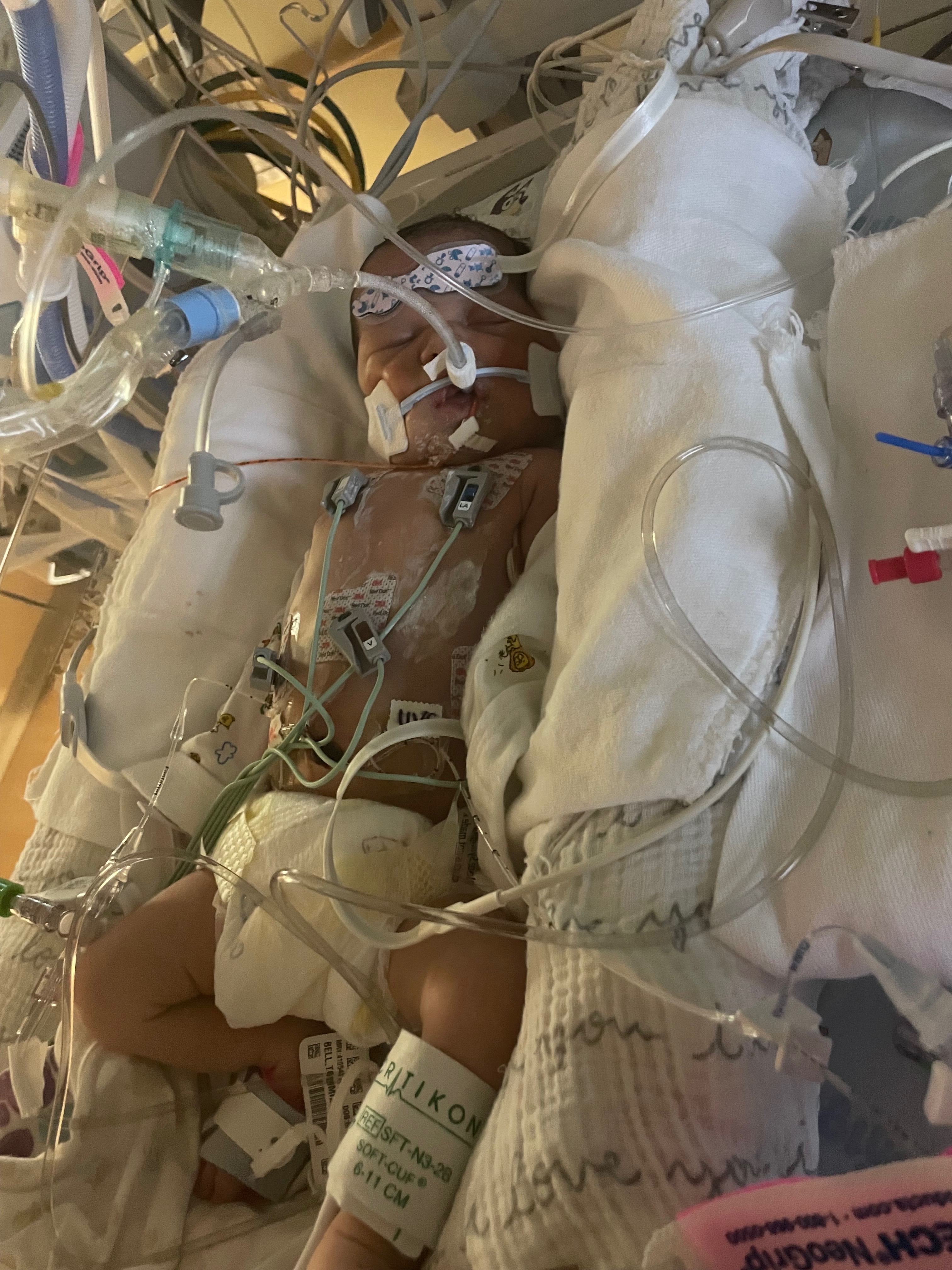 We found out at 7 months pregnant that our Tommie girl had what is called Ebstein anomaly. This is a rare heart condition where the tricuspid valves are developed a lot lower, which enlarged the heart and makes it so that the blood is flowing to the wrong parts of the body. Right now, she is on a paralytic which paralyzed her so that the machines can do the work for her. We didn’t know how severe this would be until we had her. Now that she is here, they have told us that she has one of the more severe cases of Ebstein anomaly. We aren’t sure how long she will be in the hospital; they were talking about open-heart surgery 2 days ago but they are waiting, and now she is stable, so we are waiting to see how her body does.