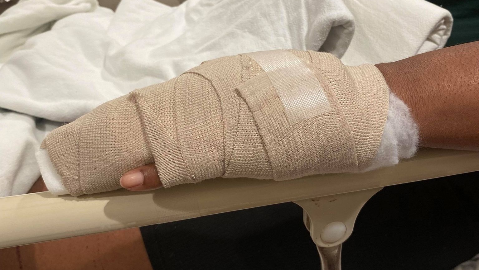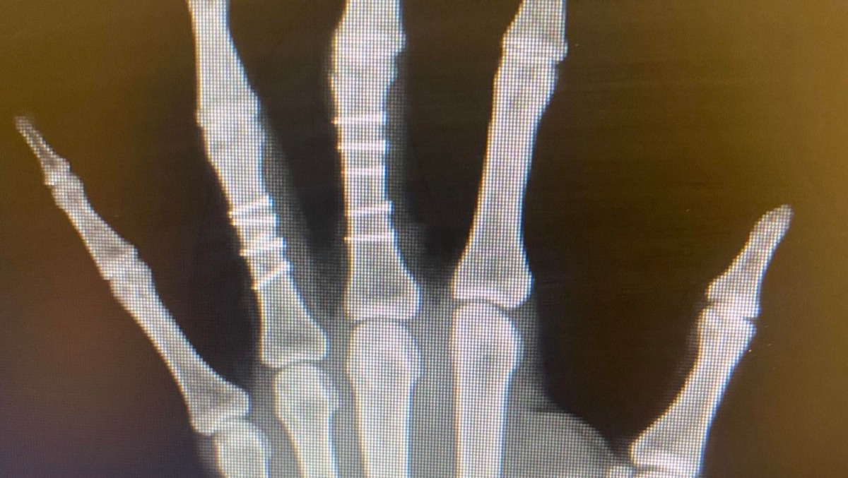 Tuesday's surgery was a success. Once the surgeon began, he quickly realized the damage was more extensive than the x-rays showed. What was supposed to be a 2-hour surgery ended up taking over 6 hours. They had to reconstruct my middle and ring finger, with 11 screws and 2 pins in my pinky finger.