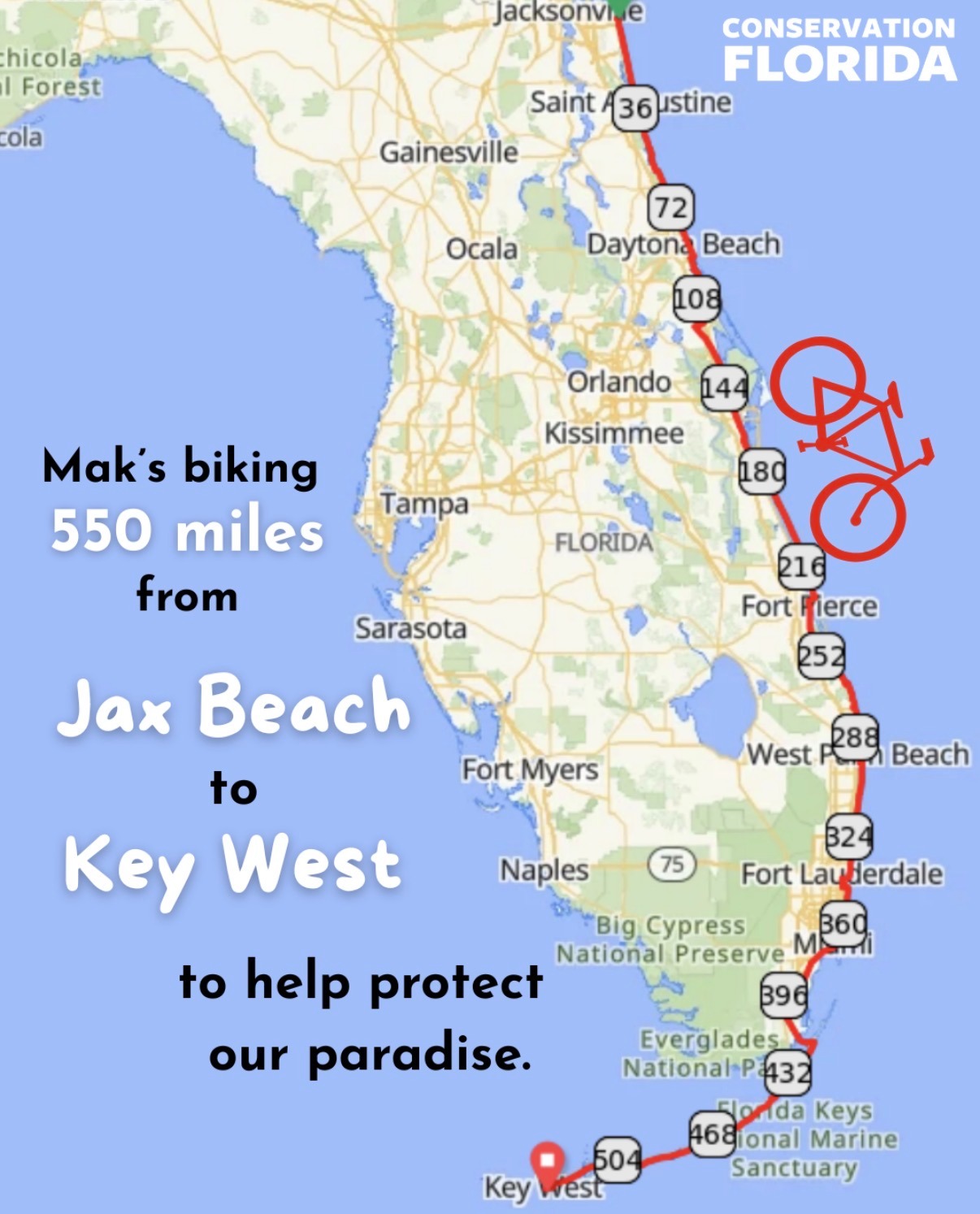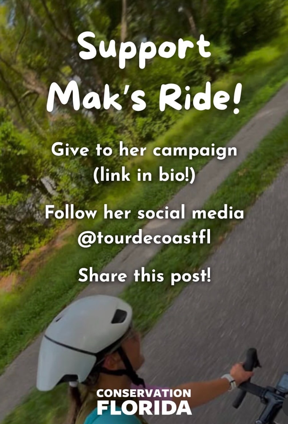 Hey my name is Mak! I am going to bike from Jacksonville Beach, Florida to Key West (about 550 miles) in 3 days to raise awareness/fundraise for Conservation Florida. I grew up loving the smell of rubber tires and cycling, so I will be calling this ride Tour de Coast. My goal is to highlight Florida’s wonderful wildlife corridors and connect local bike shops to join for segments of the ride. Your donation will go towards supporting this effort as I raise awareness and funds for Conservation Florida! Below, is a tier guide, but any and all support is greatly appreciated!