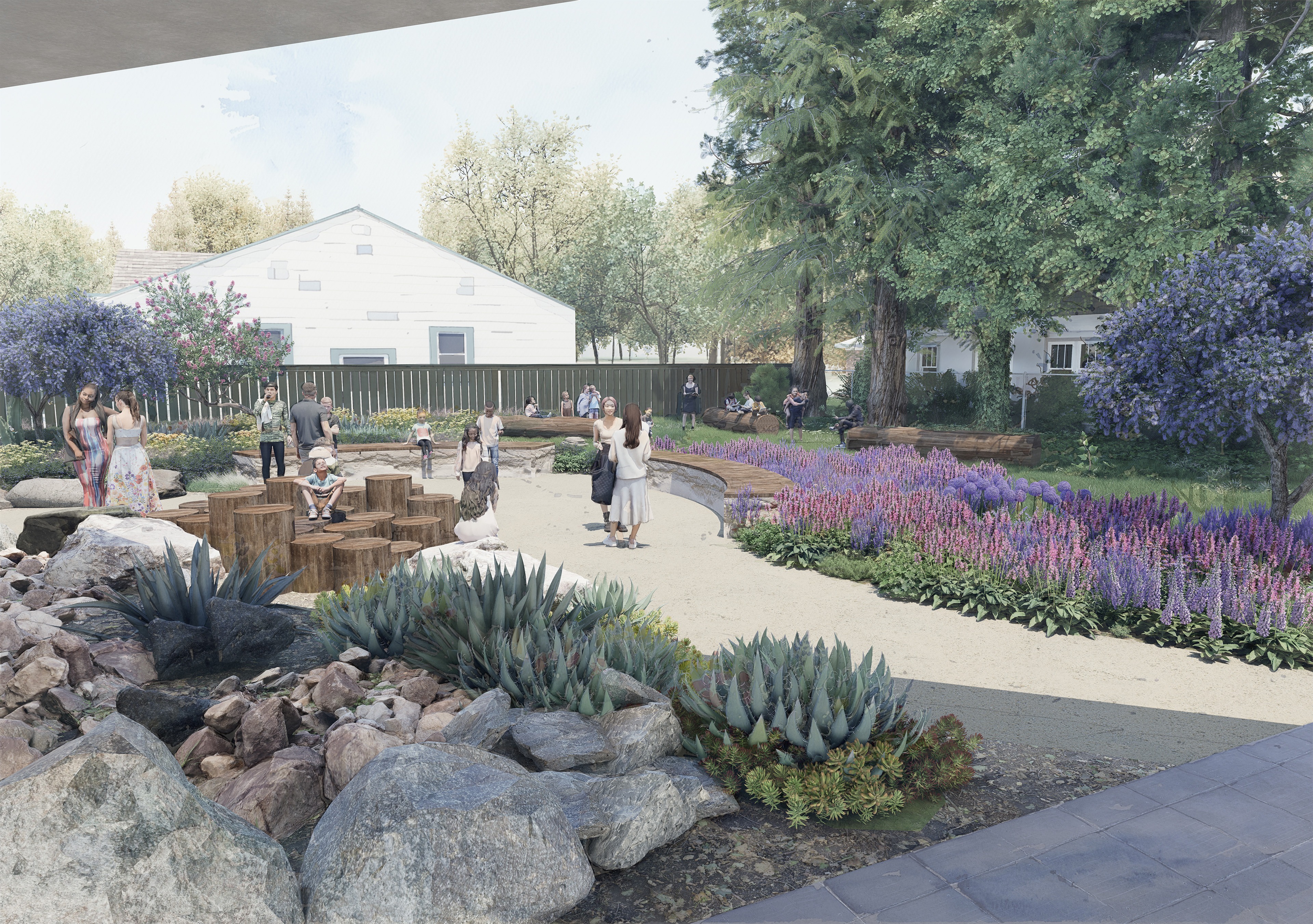 -It transforms an unused lot to a low-maintenance public green space with native plants, gravel paths, and sitting logs.