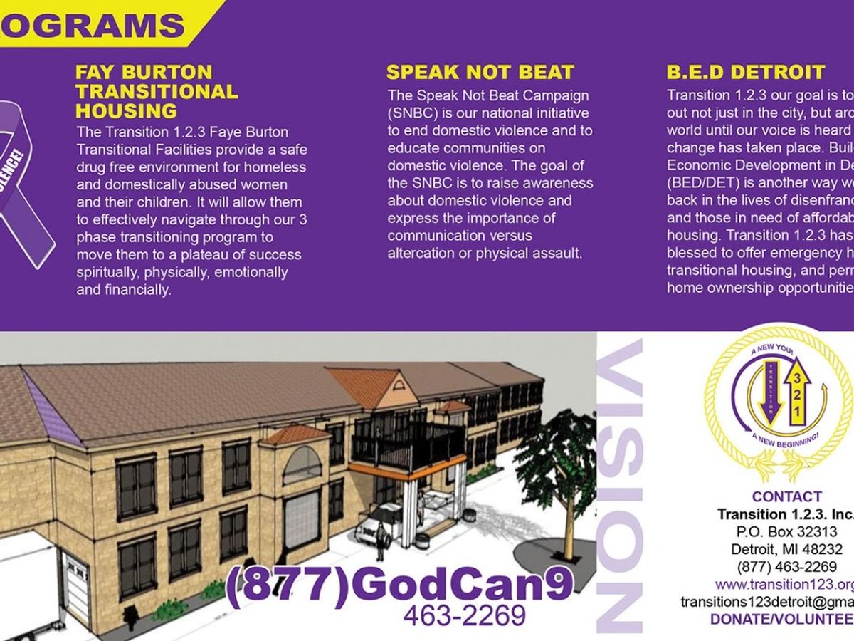 Transition 1.2.3's mission is to be a catalyst in the lives of disenfranchised women (through domestic violence) to move them to a plateau of success in every aspect of their lives spiritually, physically, emotionally and financially. We believe providing supportive services helps victims stay away for good.