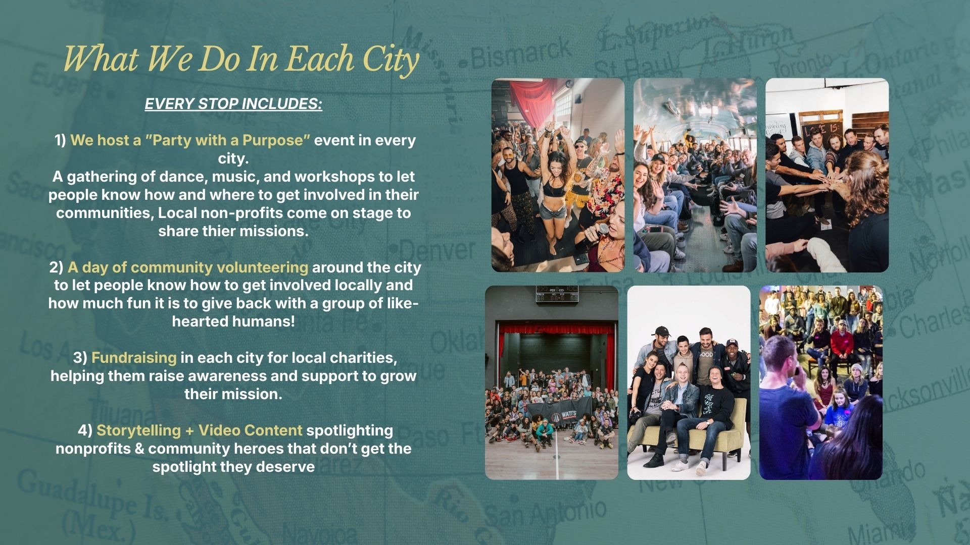 1) Bring people together to party with a Purpose.