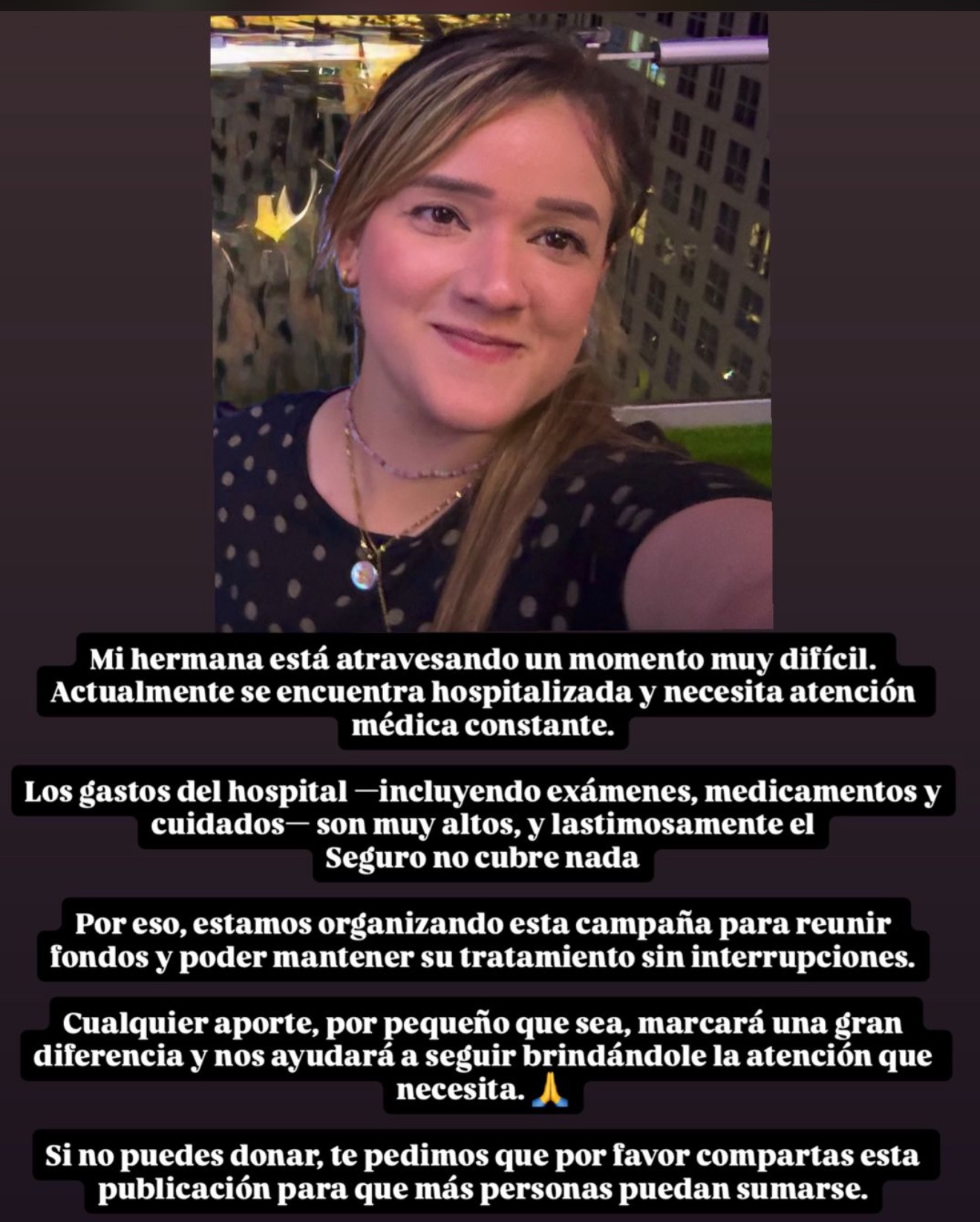 Mi mejor amiga está atravesando uno de los momentos más difíciles de su vida. Actualmente se encuentra hospitalizada y necesita una operación urgente cuyo costo asciende a $50,000 dólares. Esta cirugía es vital para su recuperación y para que pueda seguir luchando por su salud.