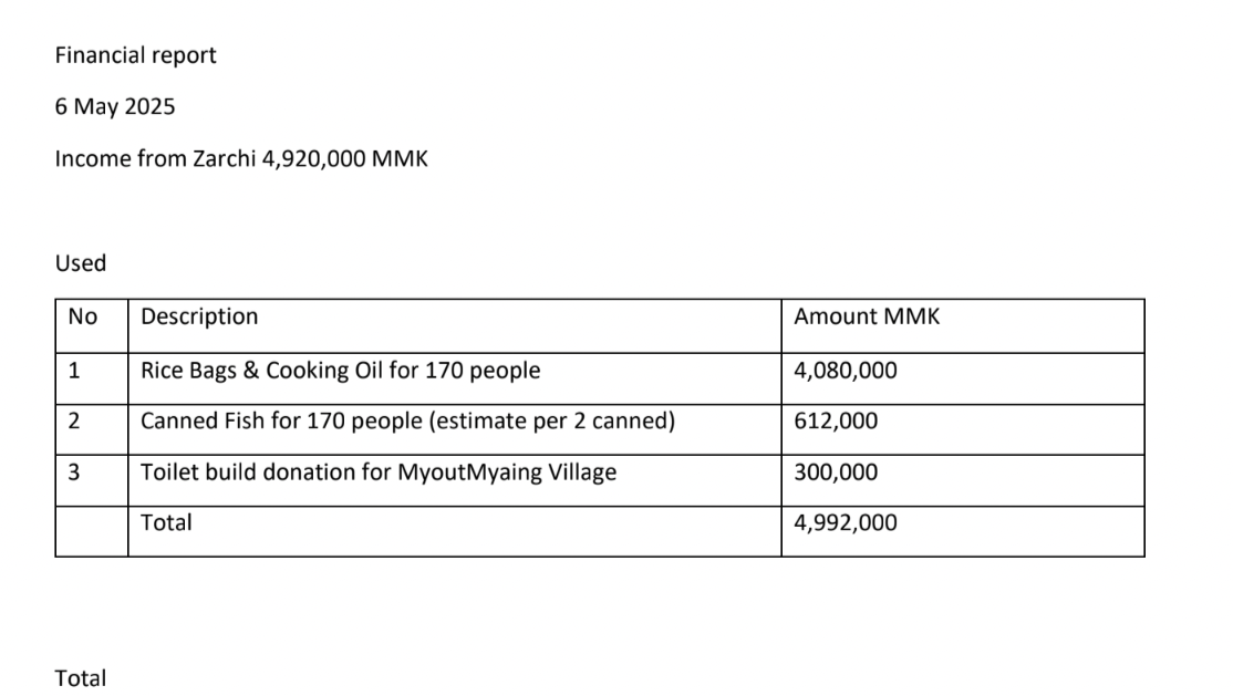 One of those contacts—a trusted Burmese woman who has stepped up to lead relief coordination—is now working directly with small, grassroots NGOs and community volunteers to distribute aid to the worst-hit areas. These are not international organizations; these are locals helping locals.