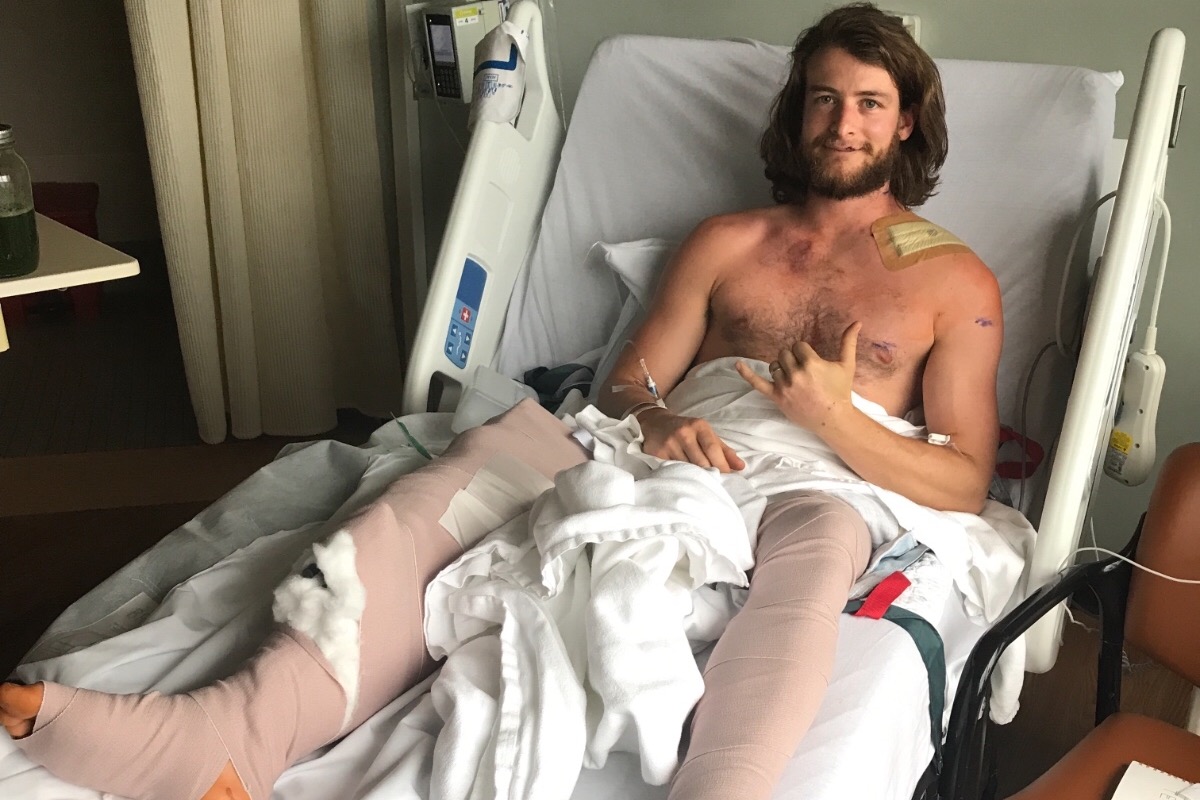 In surgery the next day, doctors secured his shoulder and foot bones with plates and screws. Surgery scheduled next week will secure his tibia with titanium hardware. For now, it’s held in place by an external fixator with four rods protruding out of his leg.