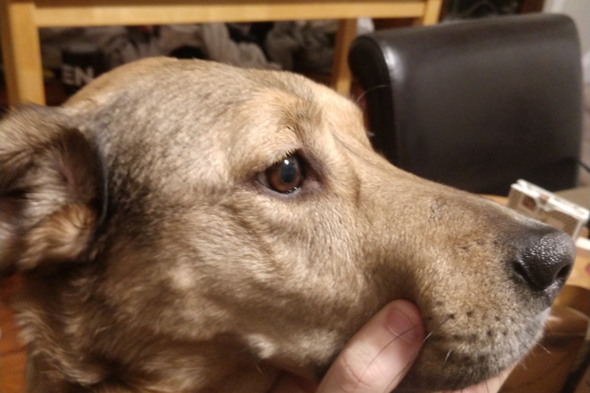 Good news is, she's not in any pain (yet). She's her regular goofy lovey self and I can pet her head and love on her all the same without her showing any signs of sensitivity or pain. However, with the things that could be wrong with her (MMM, Horner's Syndrome, cancer, maybe she had a silent stroke, etc.), even without her experiencing any pain at the moment, it could lead to big problems like blindness, or losing the ability to open her mouth, and the fact that she now is having trouble keeping food in her mouth while she eats is not a good sign.