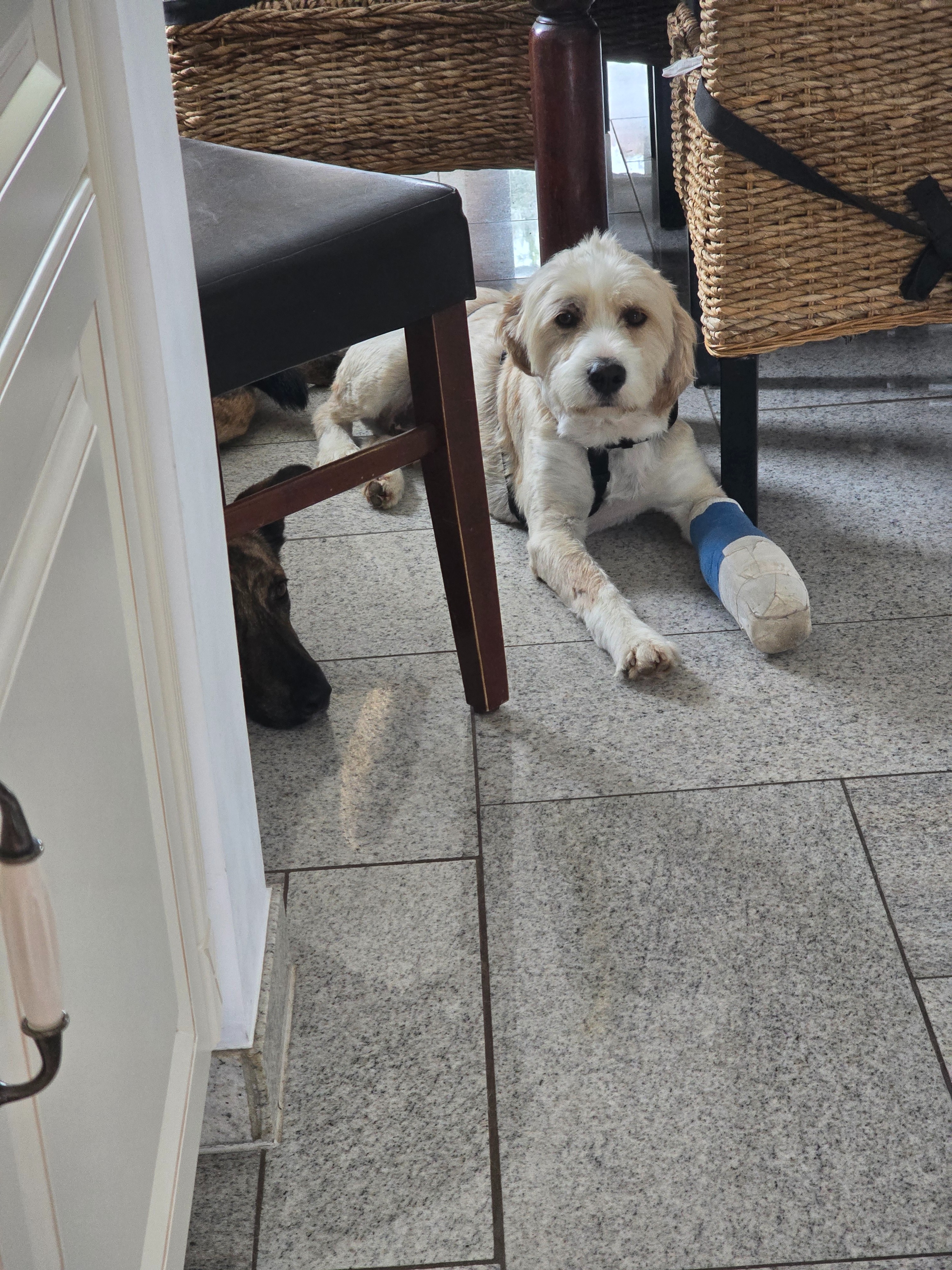 Dort wurde er gründlich untersucht und musste ein paar Tage bleiben. Oskar hatte Glück im Unglück, er ist mit einer Verletzung an der Pfote davon gekommen. Eine Verschiebung, die mit Gips und steif halten aktuell im Griff ist.