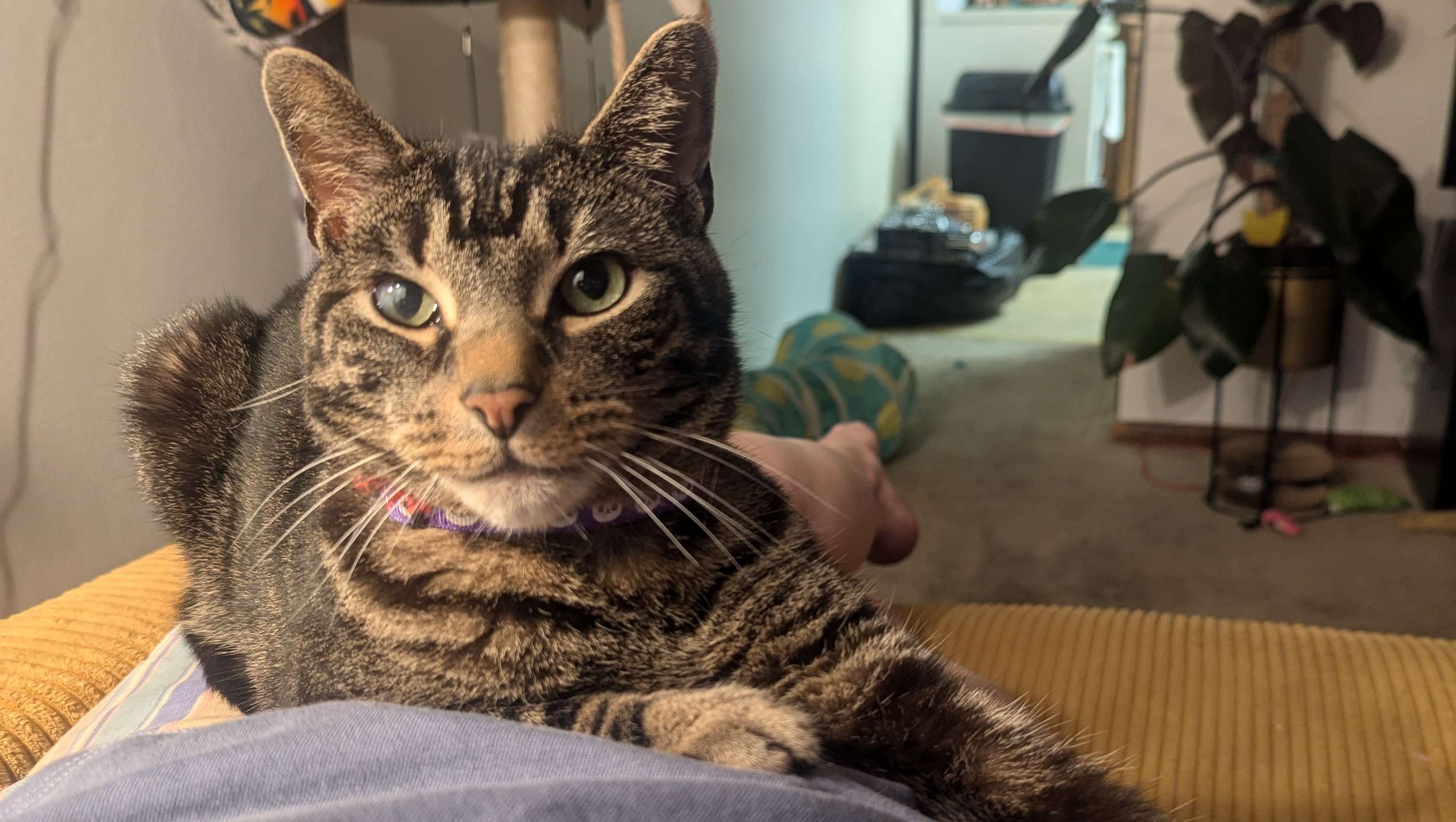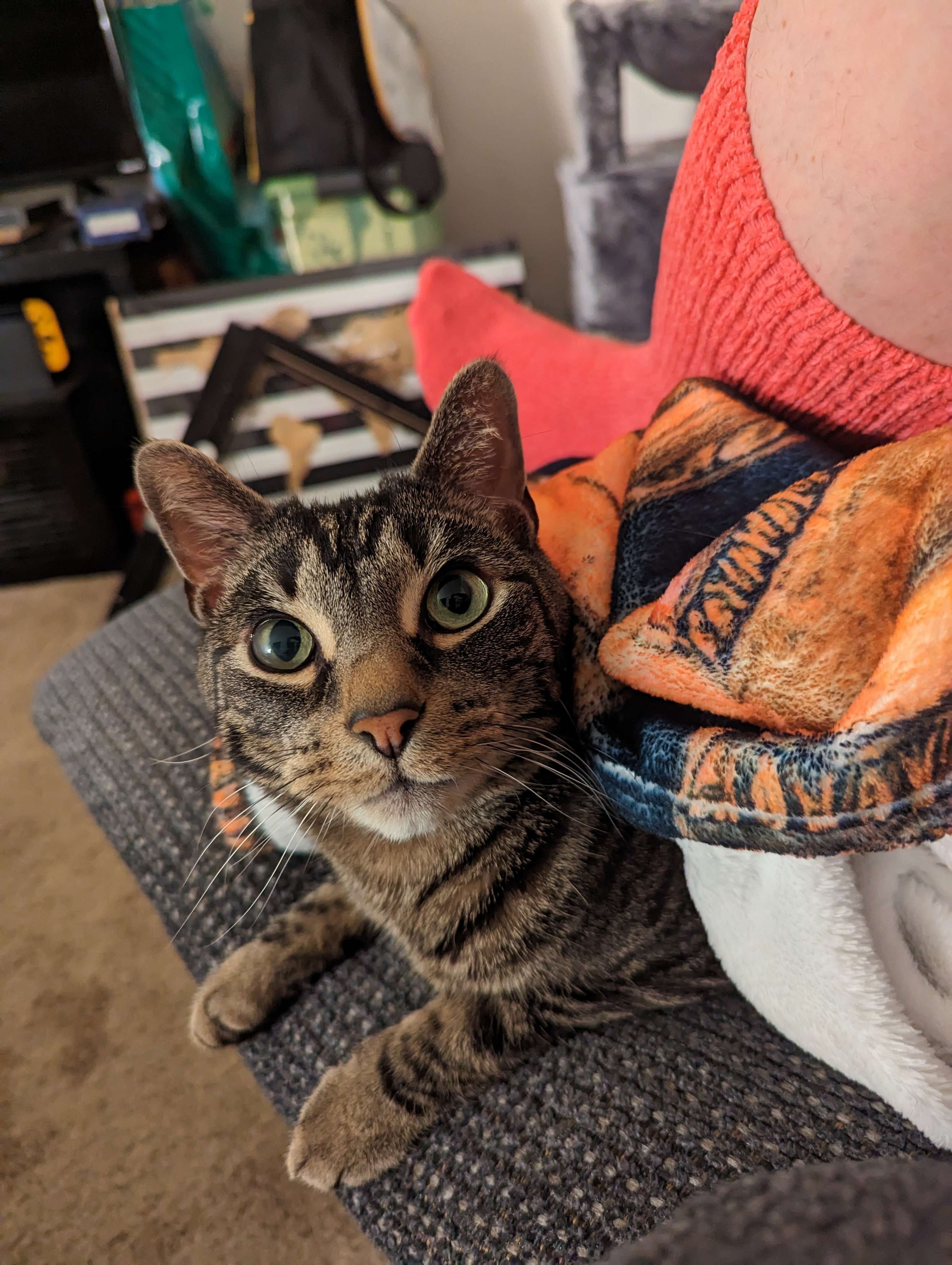 Murray is generally very happy and playful and he likes to sit on top of his humans and watch them watch TV, and when he's feeling even smaller than he already is, he likes his humans to make a tent out of their legs and a blanket, and he will crawl into that tent and sleep there in the safest place in his world.