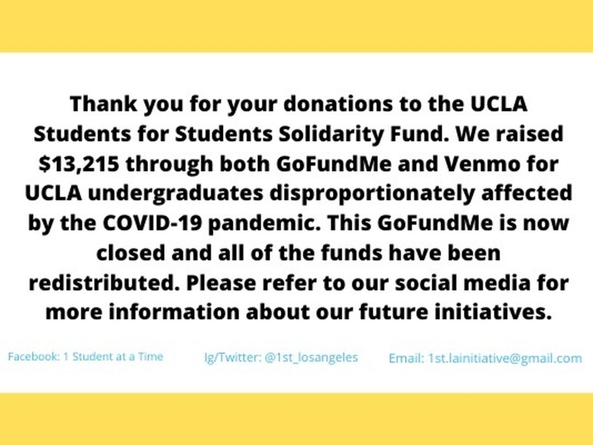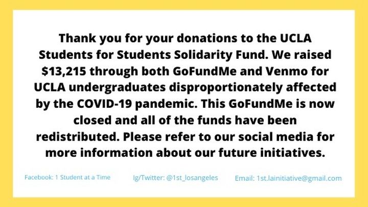 **UPDATE: We are no longer accepting donations to the UCLA Students for Students Solidarity Fund. Thank you to everyone who donated and supported this cause! We raised a total of $13,215 for UCLA undergraduates disproportionately affected by the pandemic through both GoFundMe and Venmo.  64 students received grants ranging from $125-575.  All of the funds have now been redistributed.**