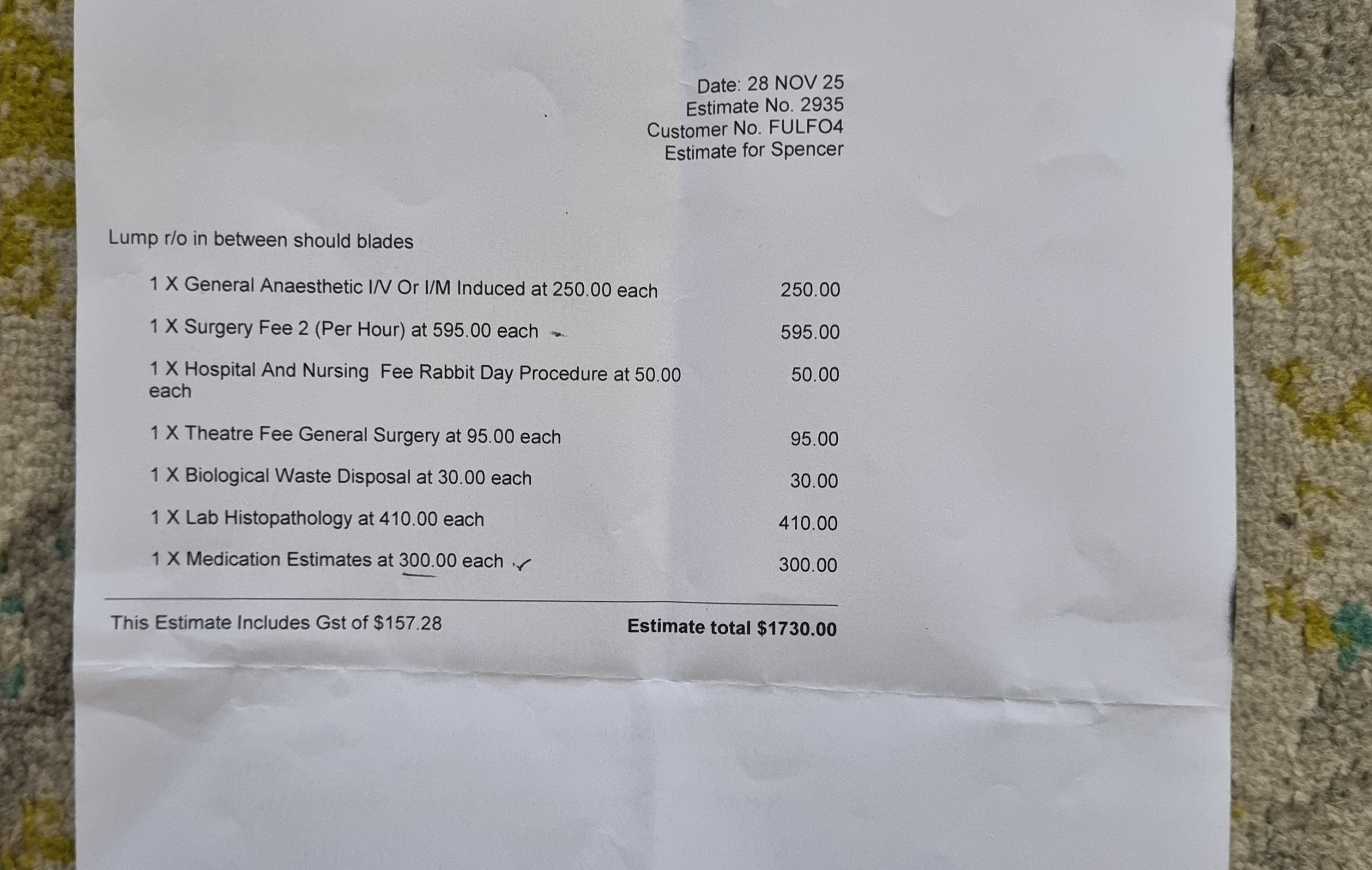 Hi. Spencer needs surgery to remove a mass between his shoulders. It needs to be sent to a lab for testing. We are probably looking at cancer. Surgery needs to be done soon as possible. Thankyou.