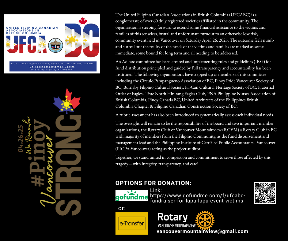 The United Filipino Canadian Associations in British Columbia (UFCABC) is a conglomerate of over 60 duly registered societies affiliated in the community. The organization is stepping forward to extend to the victims and families of this senseless, brutal and unfortunate turnout to an otherwise low risk, community event held in Vancouver on Saturday April 26, 2025 some financial assistance. The outcome feels numb and surreal but the reality of the needs of the victims and families are marked as some immediate, some bound for long term and all needing to be addressed.