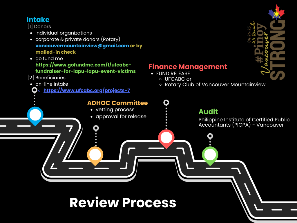 An Ad hoc committee has been created and implementing rules and guidelines (IRG) for fund distribution principled and guided by full transparency and accountability has been established. The following organizations have stepped up as members of this committee including the Circulo Pampangueno Association of BC, Pinoy Pride Vancouver Society of BC, Burnaby Filipino Cultural Society, Filipino Canadian Heritage Society of BC, Fraternal Order of Eagles - True North Hinirang Eagles Club, PNA Philippine Nurses Association of British Columbia, Pinoy Canada BC, United Architects of the Philippines British Columbia Chapter & Filipino Canadian Construction Society of BC.