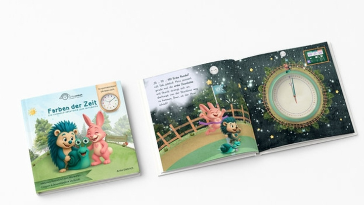 Drei Freunde – Stundi, die Stundenschnecke, Minu, der Minutenigel und Seki, der Sekundenhase – laufen über ein buntes Zifferblatt. Jede Farbe steht für eine Uhrzeit, so dass auch Kinder ohne Zahlenkenntnis den Tag verstehen können.