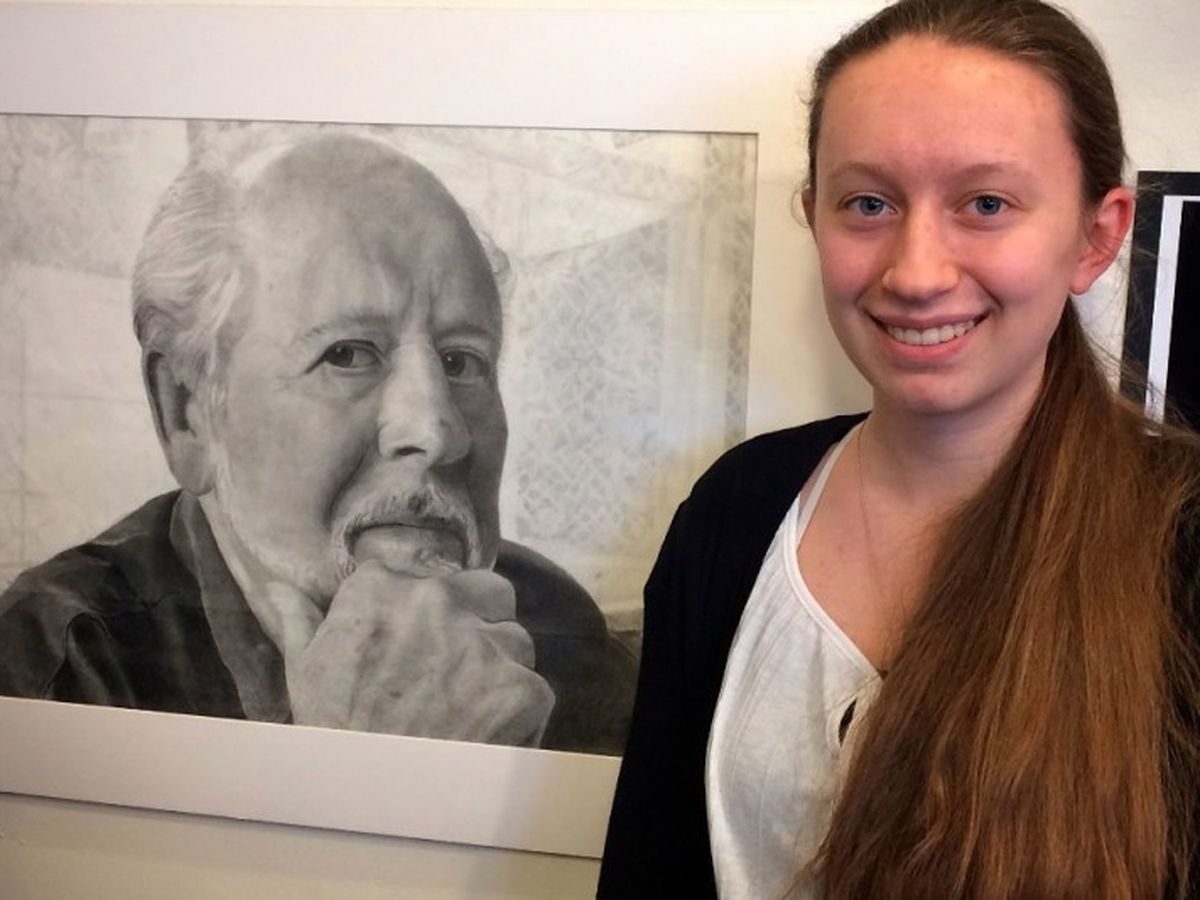 Scappoose High School Sophomore Christina Perry created her magnificent portrait of her grandfather Horst in Art Teacher Ms. Keith’s Art II class in the fall term 2015. Christina’s portrait was meticulously created using graphite on paper. Christina used a traditional grid method to achieve her photo realistic portrait based on a family photo. Christina explained “My grandpa passed in August 2013. He was good at art and loved working with his hands in different ways, like gardening and woodworking. Ever since I was little I looked up to him and admired him. He was my inspiration for my art. I wanted to create my own memorial for him in a way that he would appreciate. I poured my heart into the project and spent many hours working on it.”