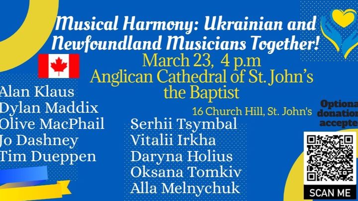 When I discussed the idea of making our concert free with optional donations to go directly to Daryna, Oksana, Sergey, and Vitalii, their first reaction was that they do not expect to be paid and they wanted to donate back to the people in Ukraine through humanitarian aid. I would love for the Newfoundland community to come together and show them appreciation for their talents by providing enough donations that they can contribute some to Ukraine while also keeping some to help build a more comfortable life for themselves here in Newfoundland.