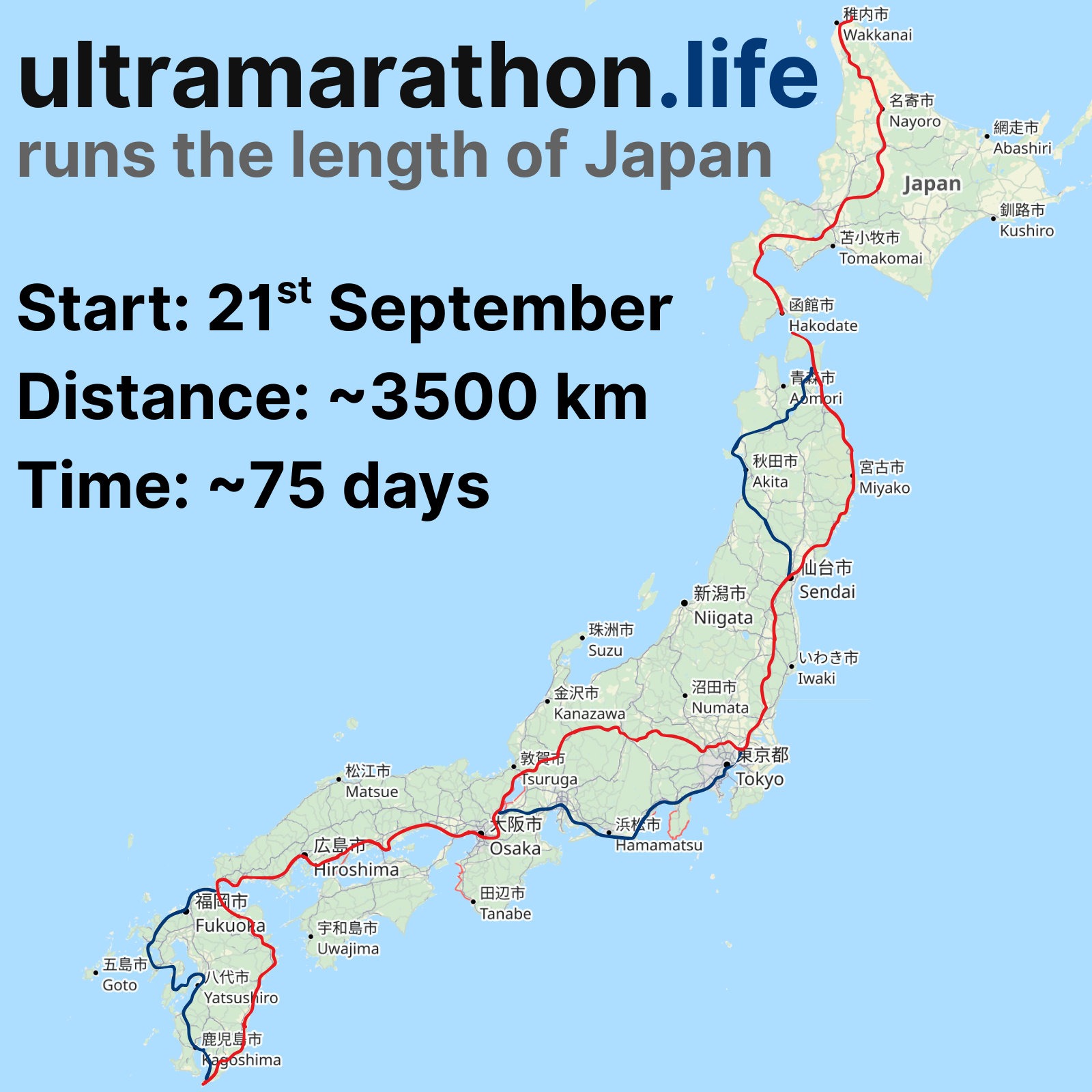 This autumn, I'll be running the length of Japan. I'll be supported by my partner, Joy, who will be cycling alongside me. We'll make our way from Cape Soya to Capa Sata over a period of around 75 days, and will be fundraising for Animal Refuge Kansai along the way.