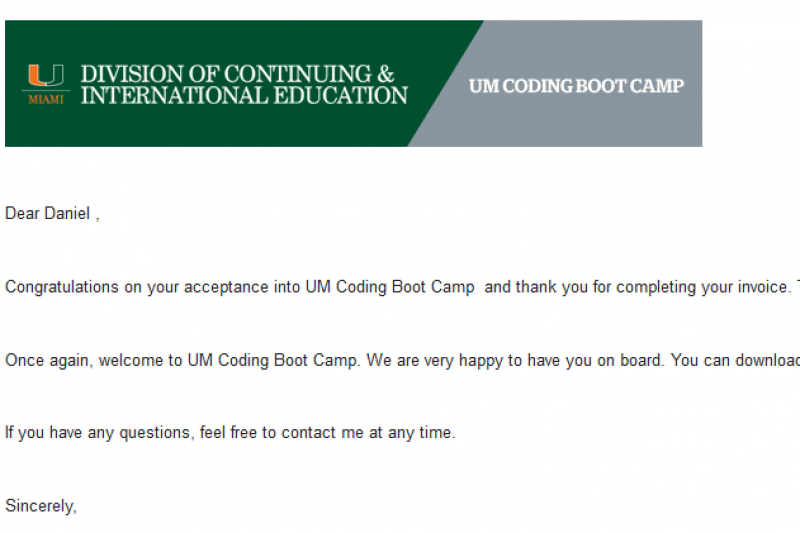 So I was recently accepted into the Univeristy of Miami's Full Stack Coding Bootcamp. This is an extremely amazing opportunity to be able to dive into a career I have always wanted to pursue! I've always been super passionate about tech but I never knew how to get started. Over the past year or so I've been taking classes on Code Academy and Udemy; getting accepted into UM has shown me that I am ready to take my next big step in chasing my dream!
