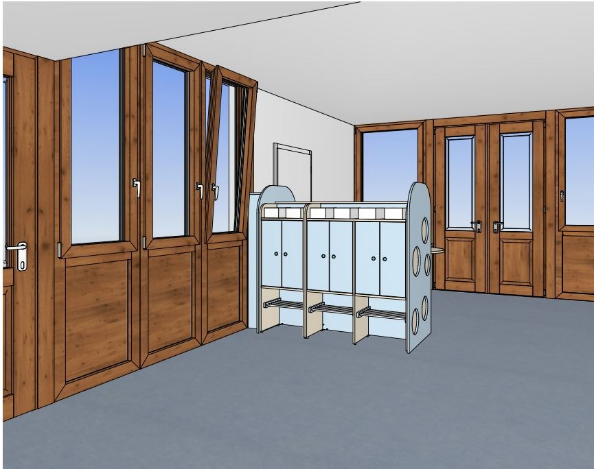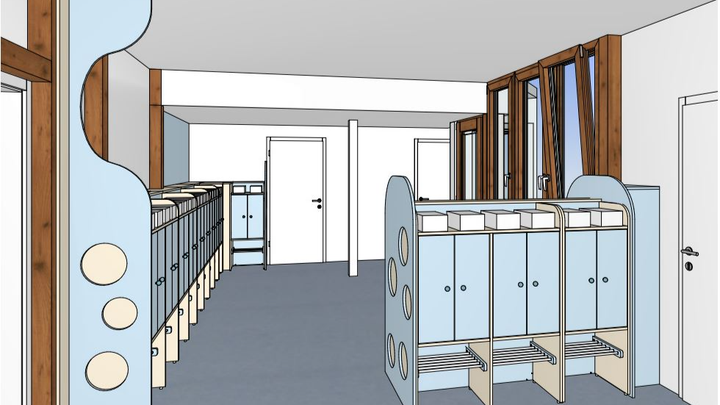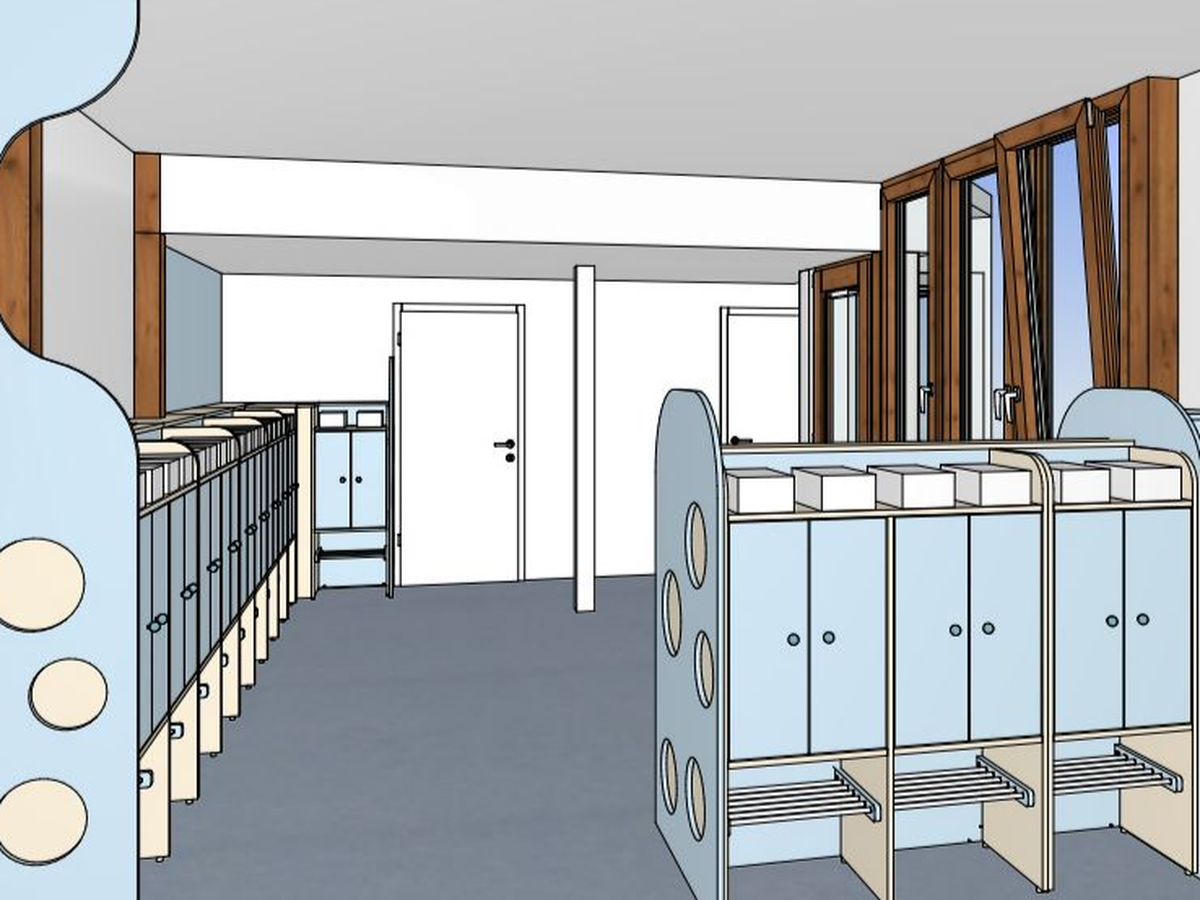 verschiedenste Kindertagesstätten betreut hat, konnten wir ein Konzept erarbeiten, bei dem wir den Eingangsbereich so umgestalten, dass die persönlichen Kleidungsstücke jedes Kindes in einem hellen persönlichen Spind untergebracht werden und ein entsprechend nutzbarer Empfangsbereich eingerichtet werden kann.