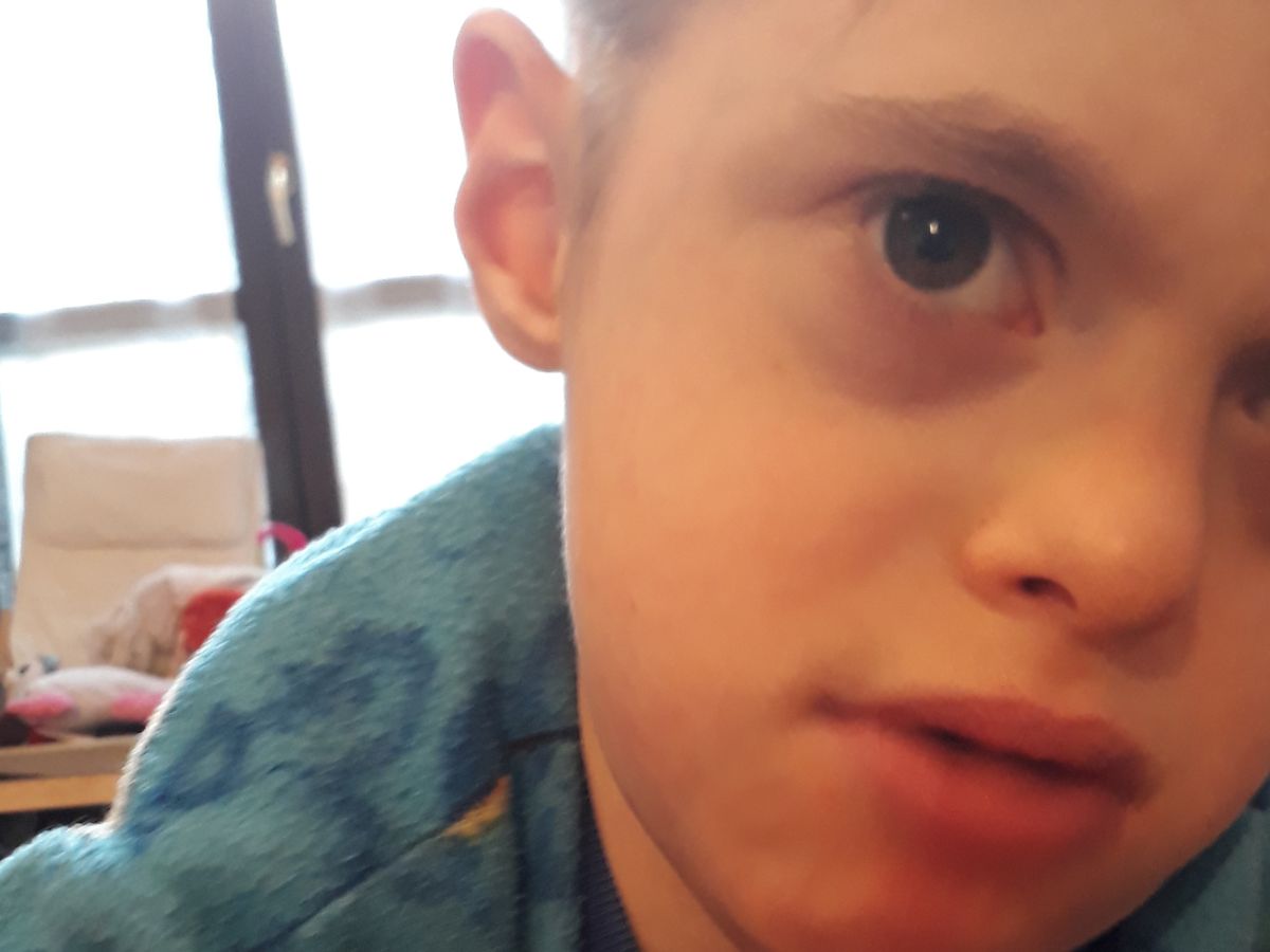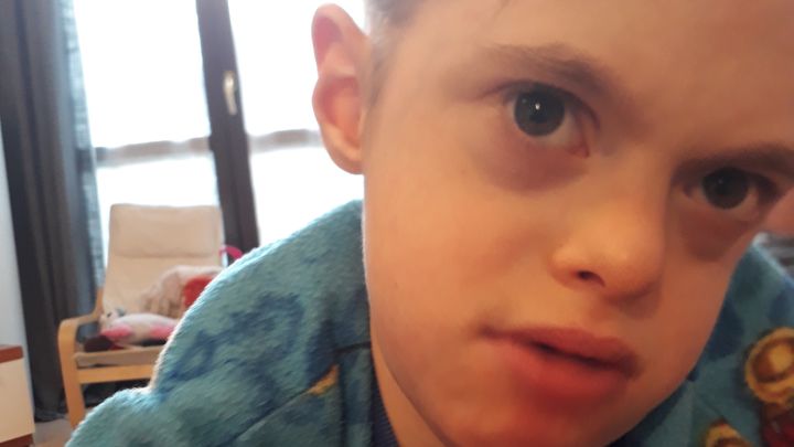 Nato con la Sindrome di Down, prematuro e con sequele neurologiche, che gli hanno causato epilessia, gravissimi deficit cognitivi e seria compromissione motoria. A parte quando sta male e magari non dorme per giorni, è un giovanotto infinitamente solare e gioioso nonostante le sue mille difficoltà, ma necessita di supporto per la vita quotidiana e gli spostamenti e stimoli continui per non regredire nelle sue piccole conquiste di autonomia.