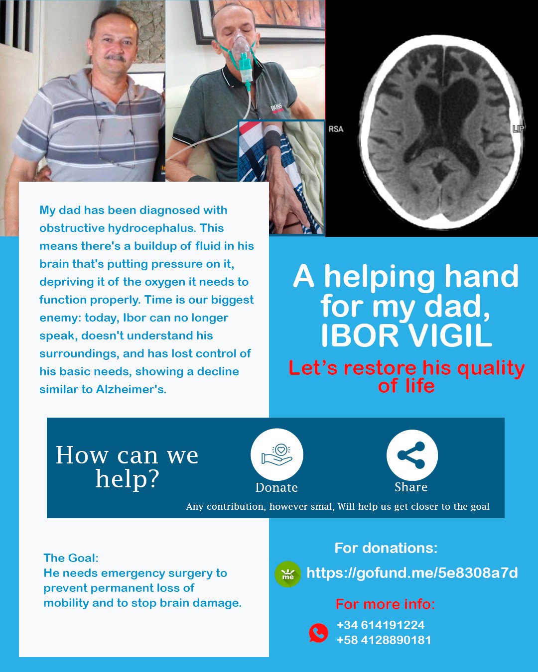 Mi papi ha sido diagnosticado con Hidrocefalia Obstructiva. Esta condición provoca una acumulación de líquido en su cerebro que impide que el oxígeno llegue correctamente a sus neuronas. Debido a esto, su salud se ha deteriorado de forma alarmante y acelerada. Para nuestra familia es doloroso ver cómo la enfermedad le está robando su esencia.